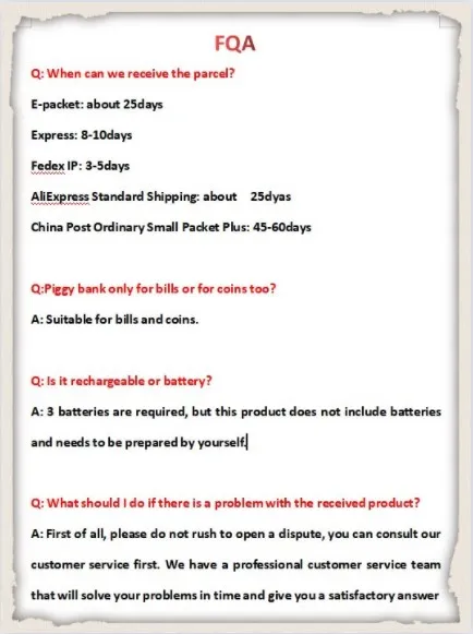 Тип: музыкальная шкатулка для денегМатериал: пластикБатарея: 3 шт. AA (не входит в комплект)Пароль по умолчанию: 0000Примечание: скрытая кнопка пароля в передней крышке автомобиляРазмер: 30*15*15 см/11,79*5,9*5,9 дюймовВес нетто: 700 г/24,69 унций
