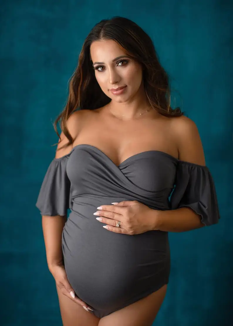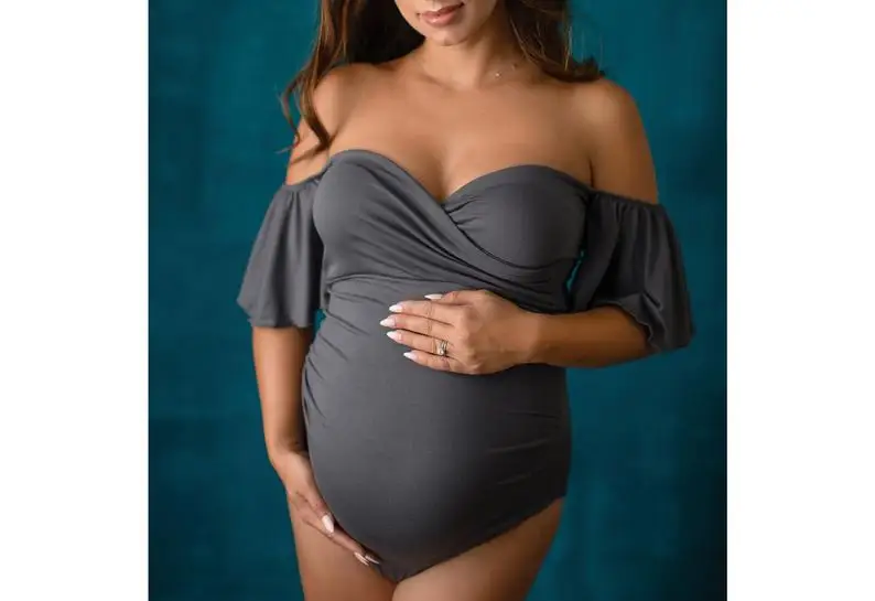 Эластичный тканевый боди для беременных с открытыми плечами фотогра...