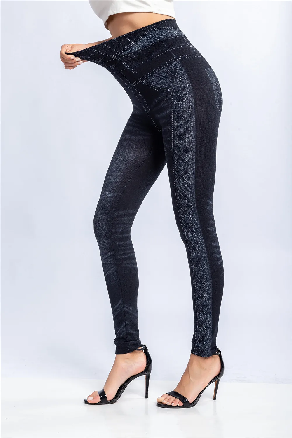 Леггинсы женские эластичные из искусственного денима, с узором в ви...