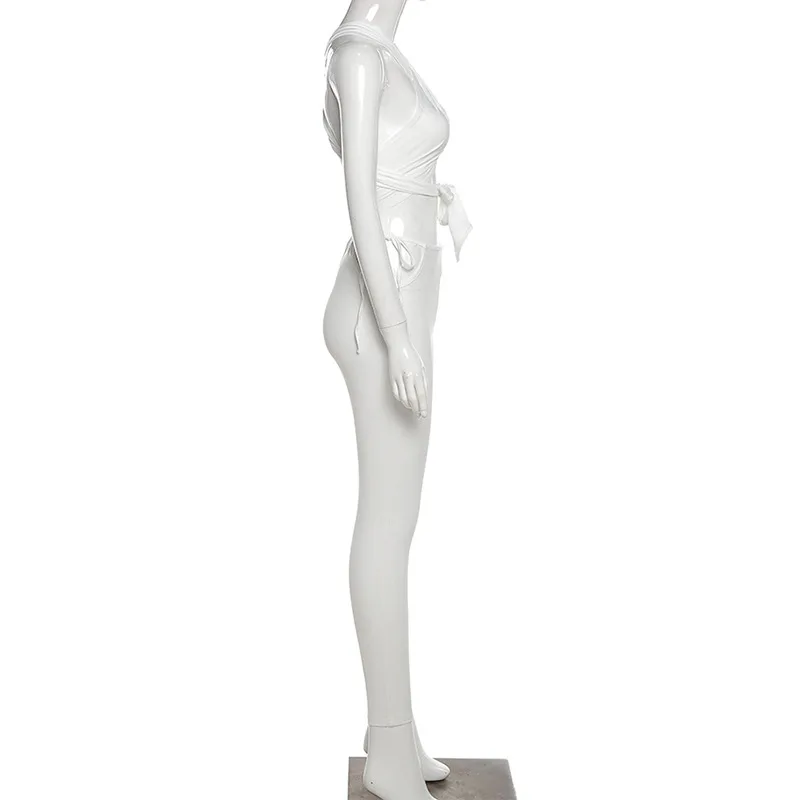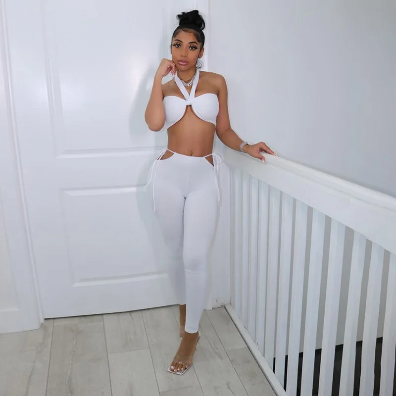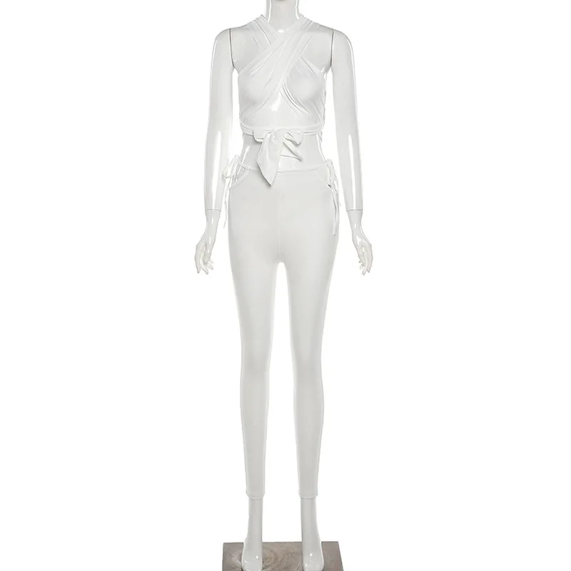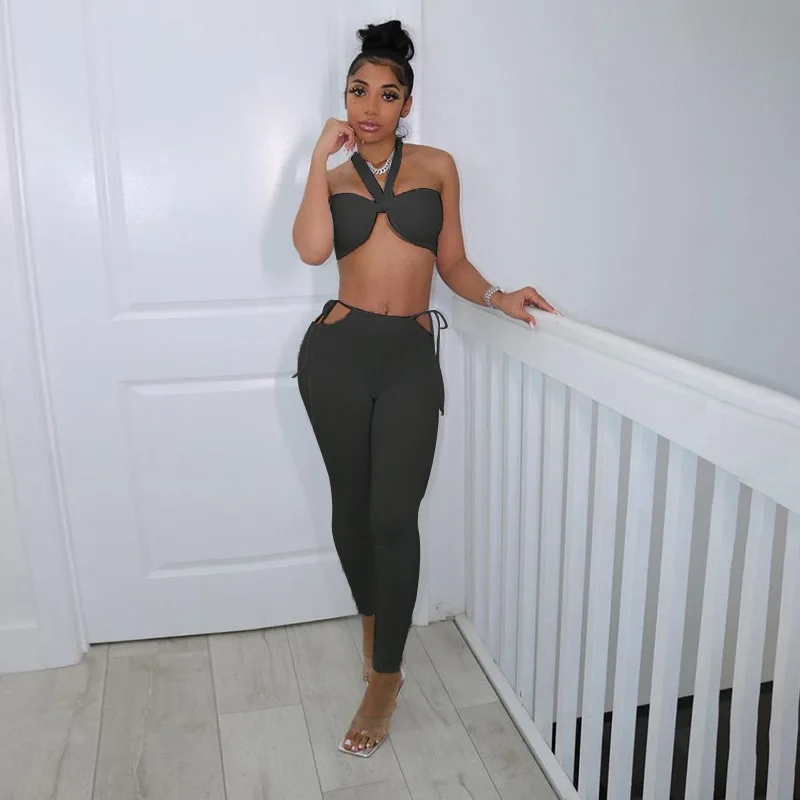 Женский Повседневный комплект без рукавов, бюстгальтер с лямкой на шее + штаны на шнуровке, однотонная женская сексуальная одежда, дышащая летняя одежда