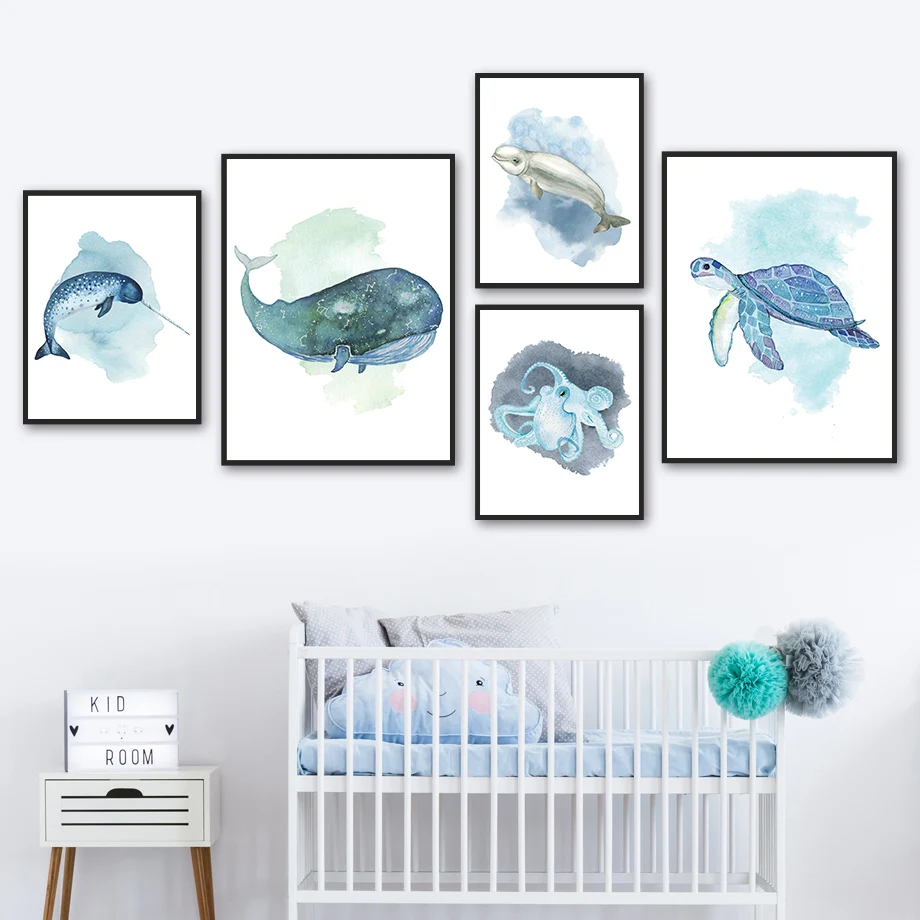 Морская жизнь, Кит, Акула, черепаха, дельфин, осьминог, настенная Картина на холсте, скандинавские плакаты и принты, настенные картины, декор для детской комнаты