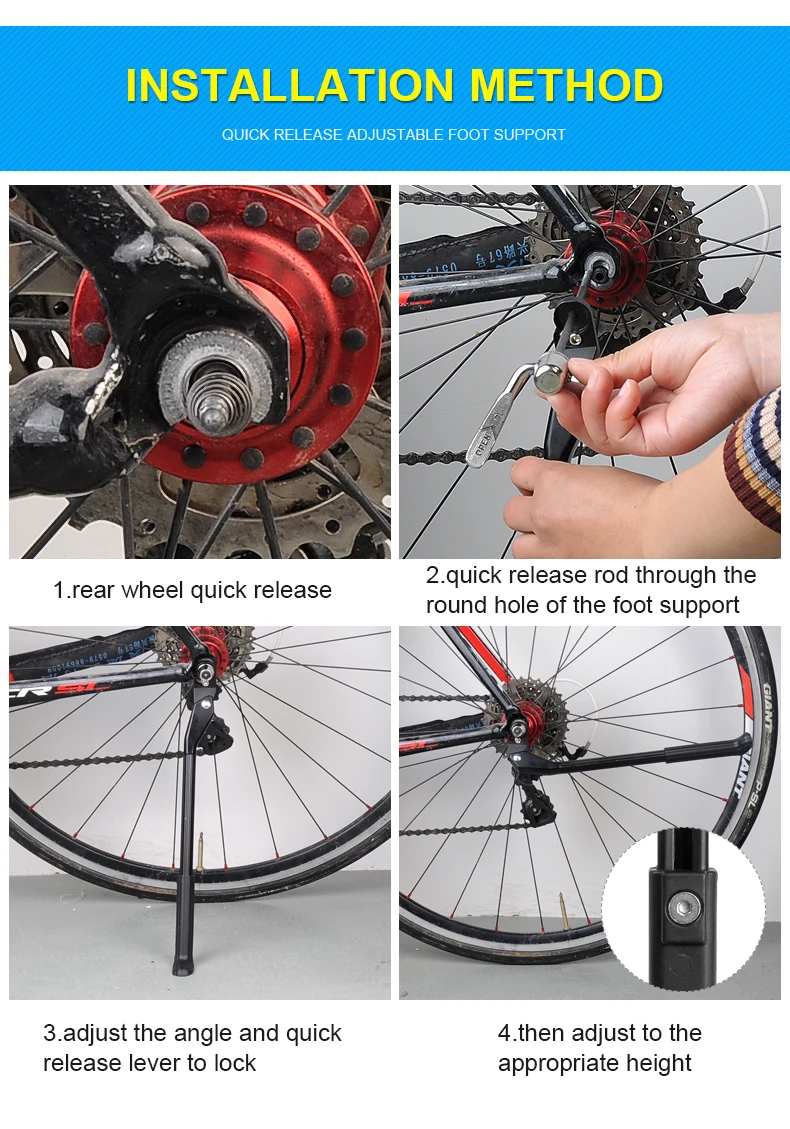 1: быстросъемное заднее колесо2: быстроразъемный Стержень через круглое отверстие опоры для ног3: Отрегулируйте угол и быстроразъемный рычаг для блокировки4: Затем Отрегулируйте подходящую высоту