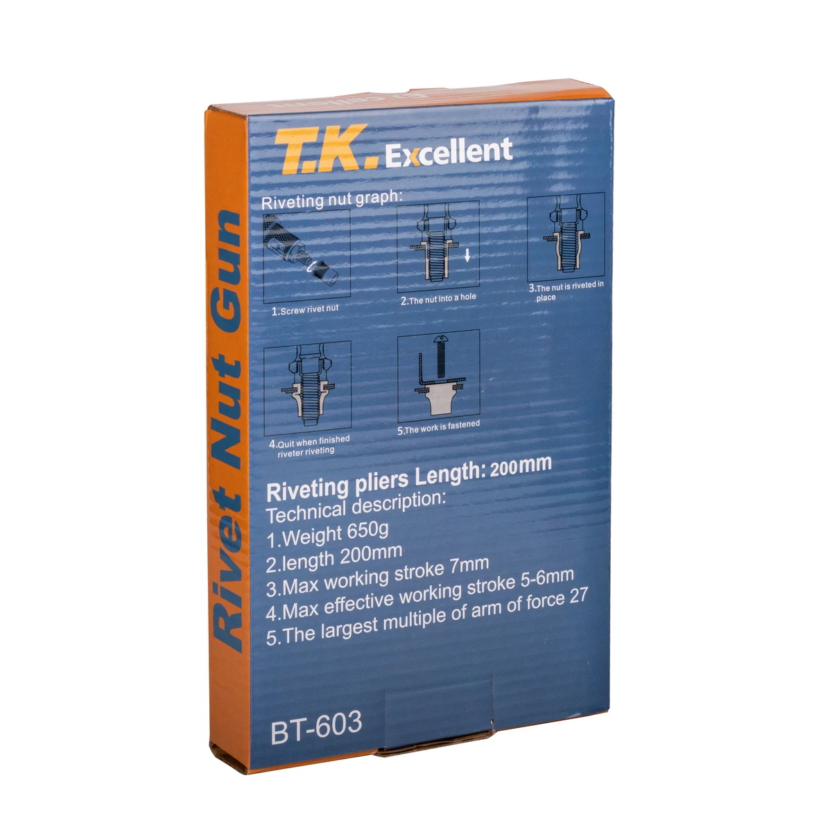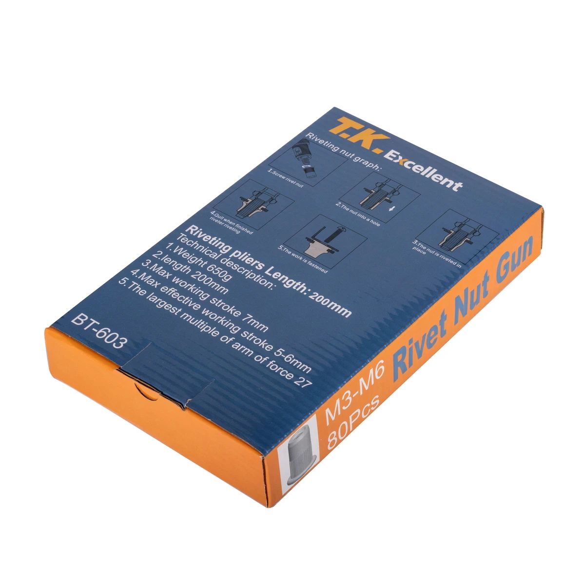 1. 1 х BT-603 ручной клепальный пистолет2. Оправы: 1 x M3, 1 x M4, 1 x M5, 1 x M63. 1 х гаечный ключ4. Гайки с заклепками: M3, M4, M5, M6 (80 шт.)