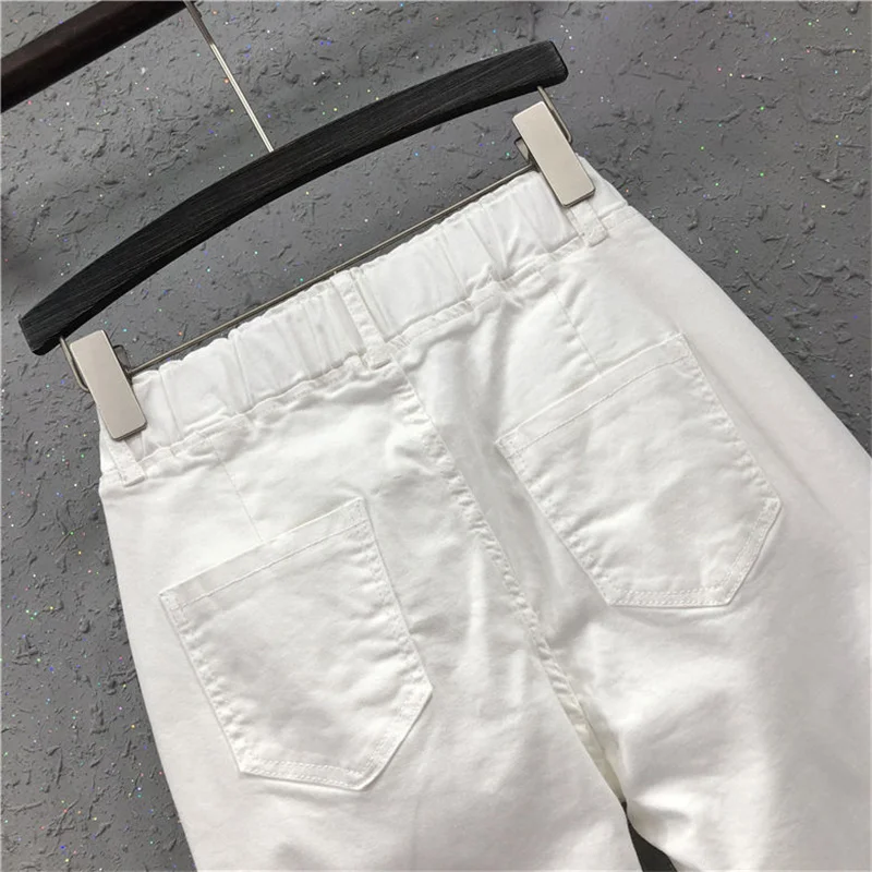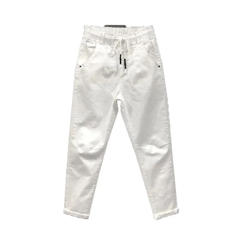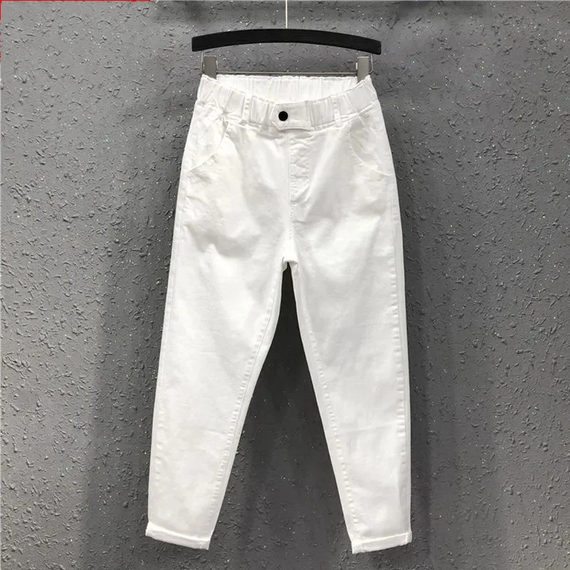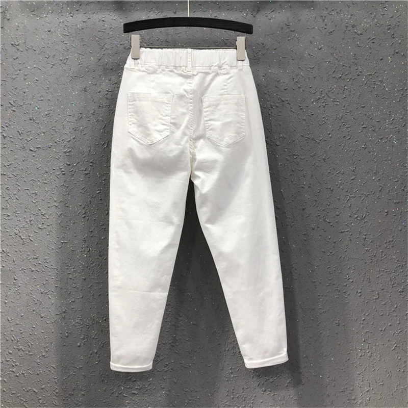 Женские джинсы с эластичным поясом, белые свободные хлопковые брюки...
