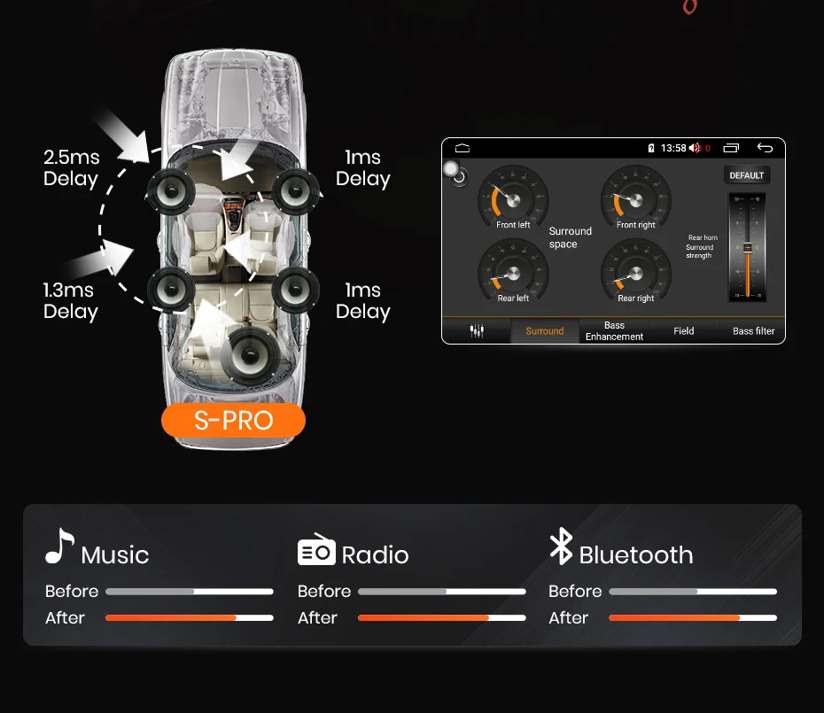 > Со встроенным усилением 4*50 Вт, музыка становится четкой даже при высоких томах.> По индивидуальному заказу звуковая с вашими личными предпочтениями с 9 графический эквалайзер. Поп, рок, джаз,Классический, плоский, пользовательский, голосовой. Несколько вариантов настройки позволяют адаптировать аудио опыт по своему вкусу.