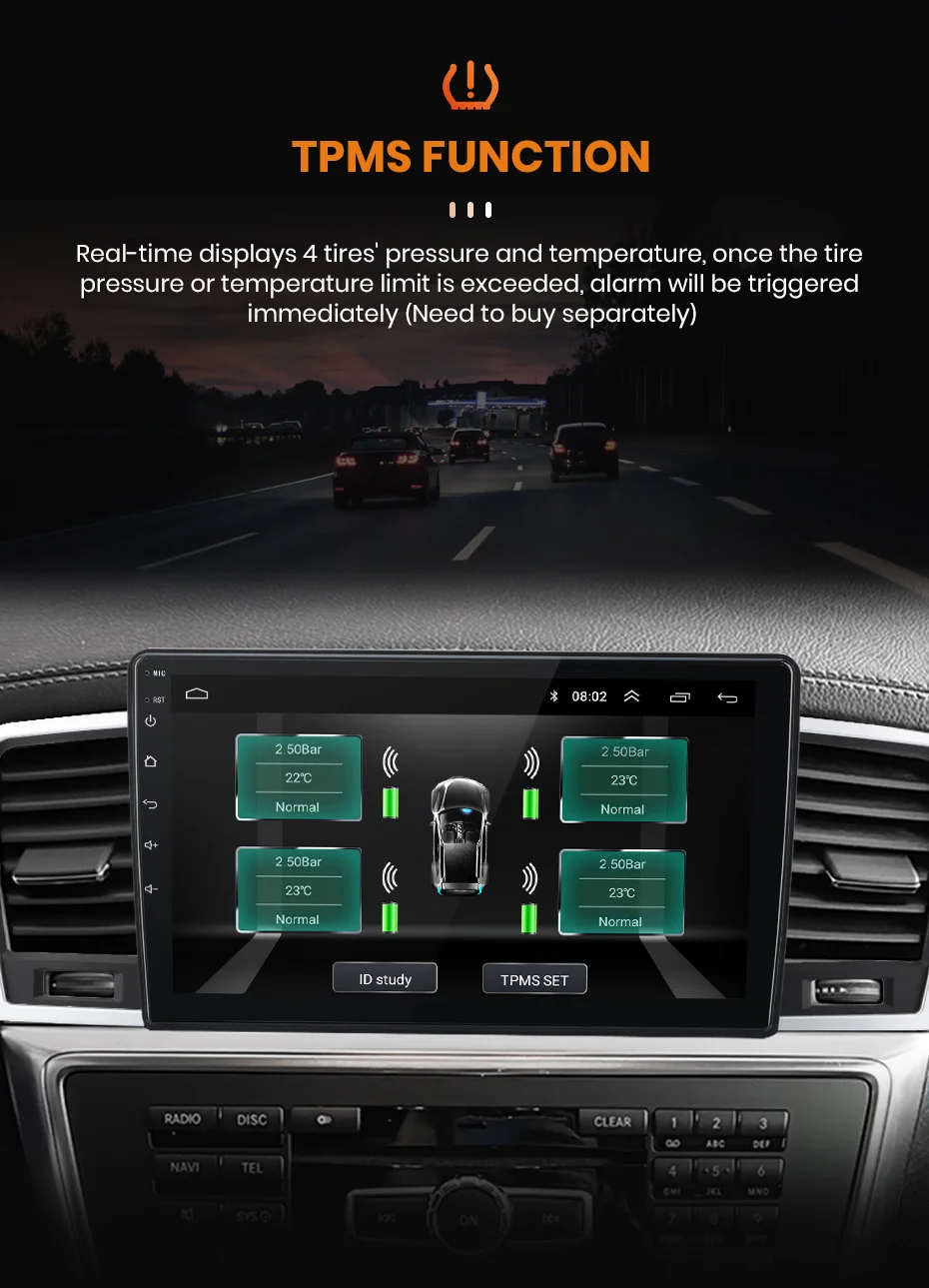 > Отображает 4 давления и температуры в режиме реального времени. Как только давление или температура в шинах будут необычными, сразу же будет сигнал тревоги.