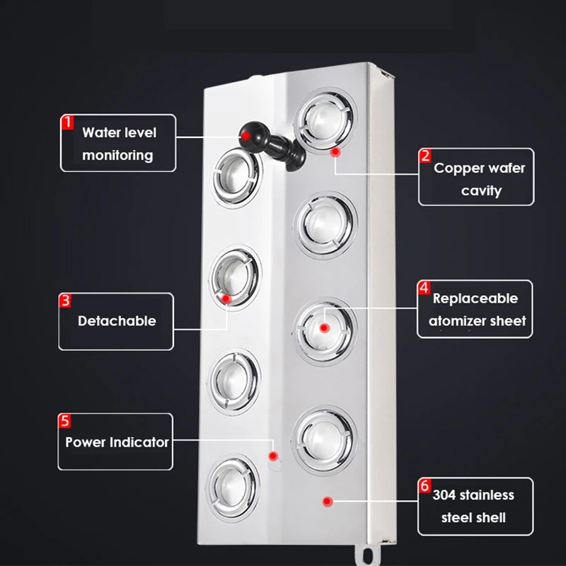 Рабочее напряжение атомайзера: DC45V ± 3VРаспыления способность: 3 кг/ч-8,5 кг/ч (при температуре 35 ℃, уровня воды, чем распылитель 1-1,5 см)Рабочая температура: 5-55 ℃Материал: нержавеющая сталь 304Импульсный источник питания Входное напряжение: AC220V-240V, 50 Гц-60 ГцВыходное напряжение импульсного источника питания: DC48V