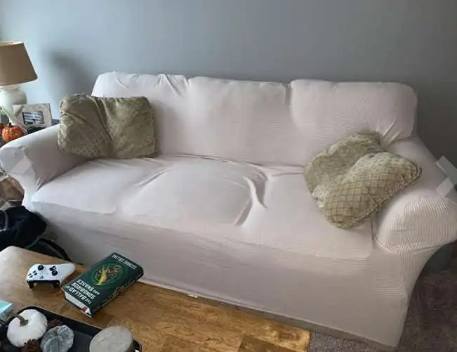 Мне нравится этот чехол для дивана и мне нравится светлый цвет, так как он отлично сочетается со светлой и воздушной цветовой схемой гостиной! Как и любой другой чехол для дивана, я постоянно настраиваю его и подтягиваю его к подушкам! Но мне это нравится!