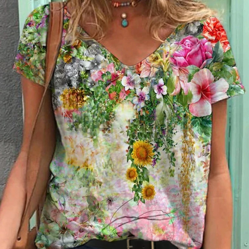 Блузка женская с цветочным принтом, V-образным вырезом и коротким рукавом