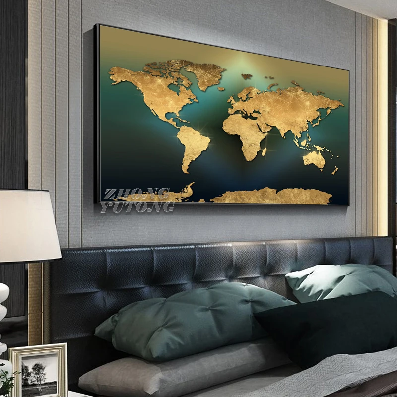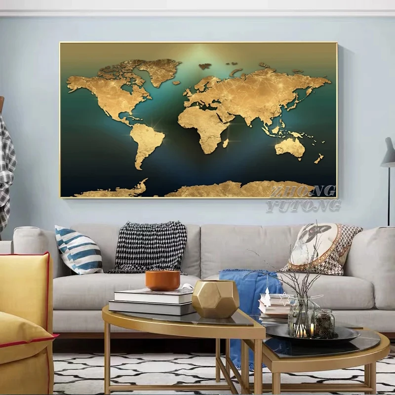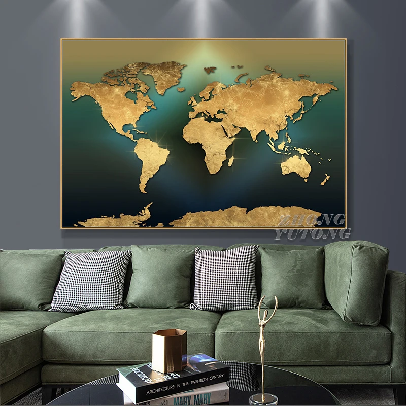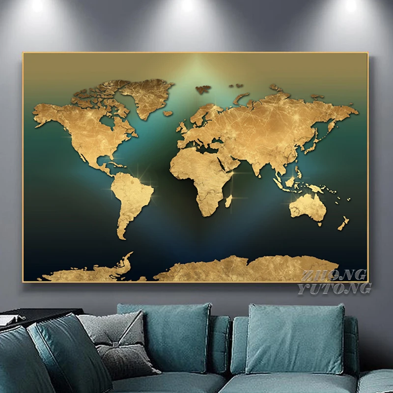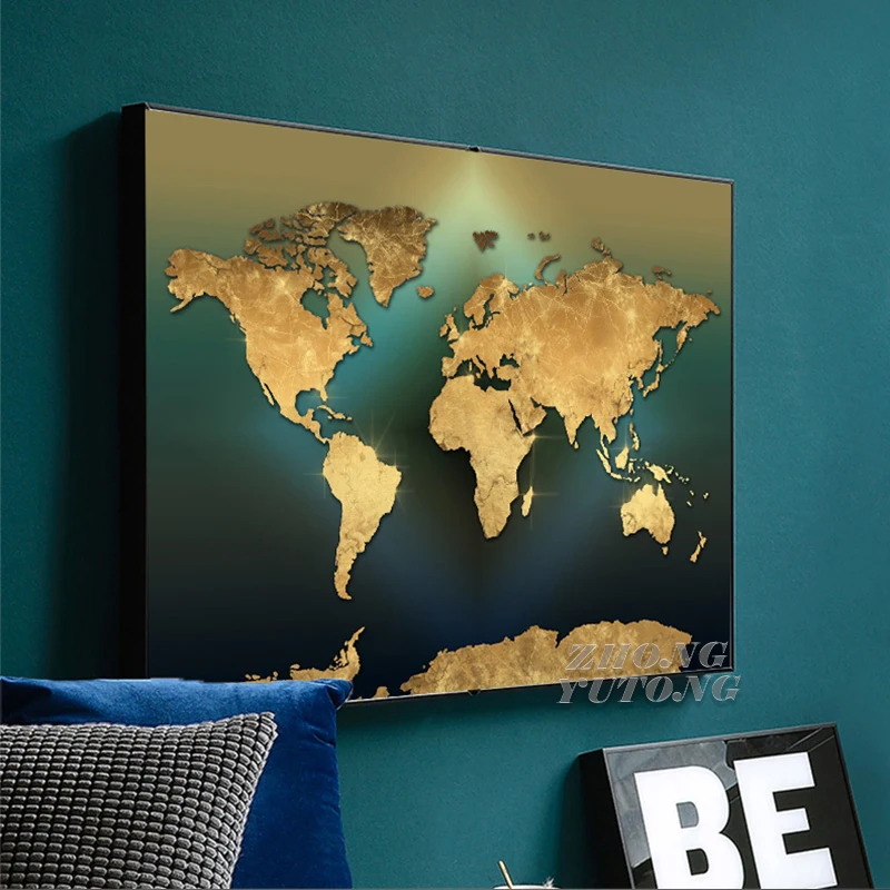 Современная Карта мира, Картина на холсте, Скандинавская Золотая зе...