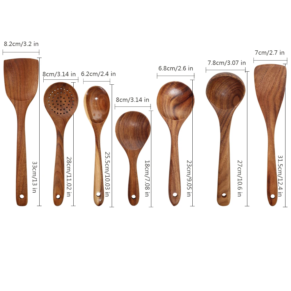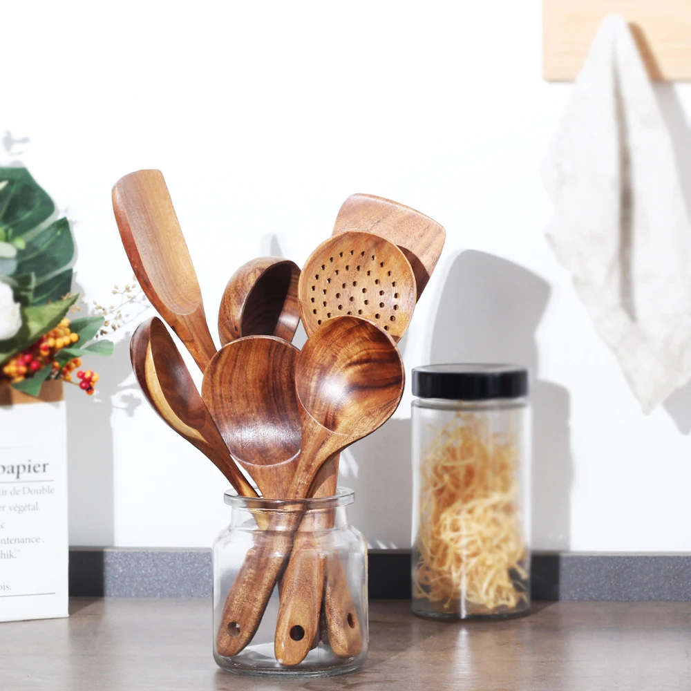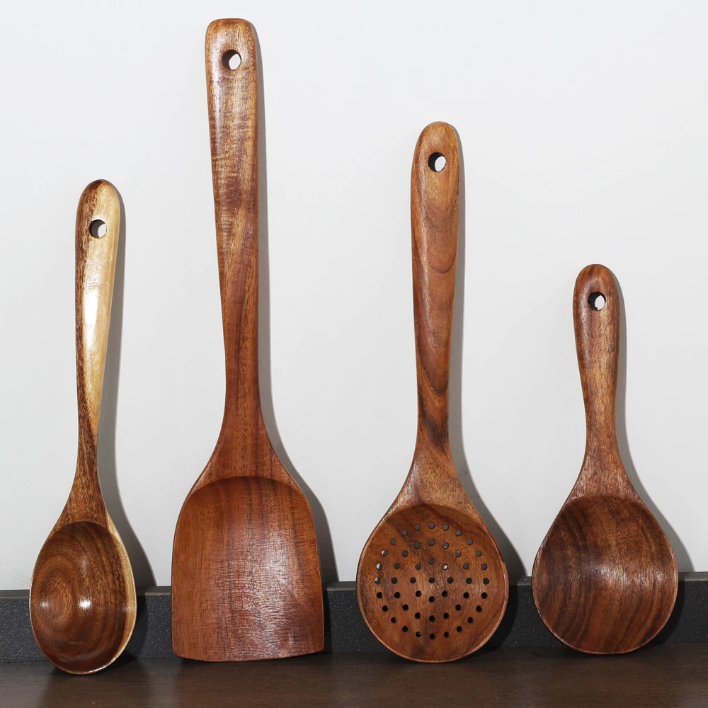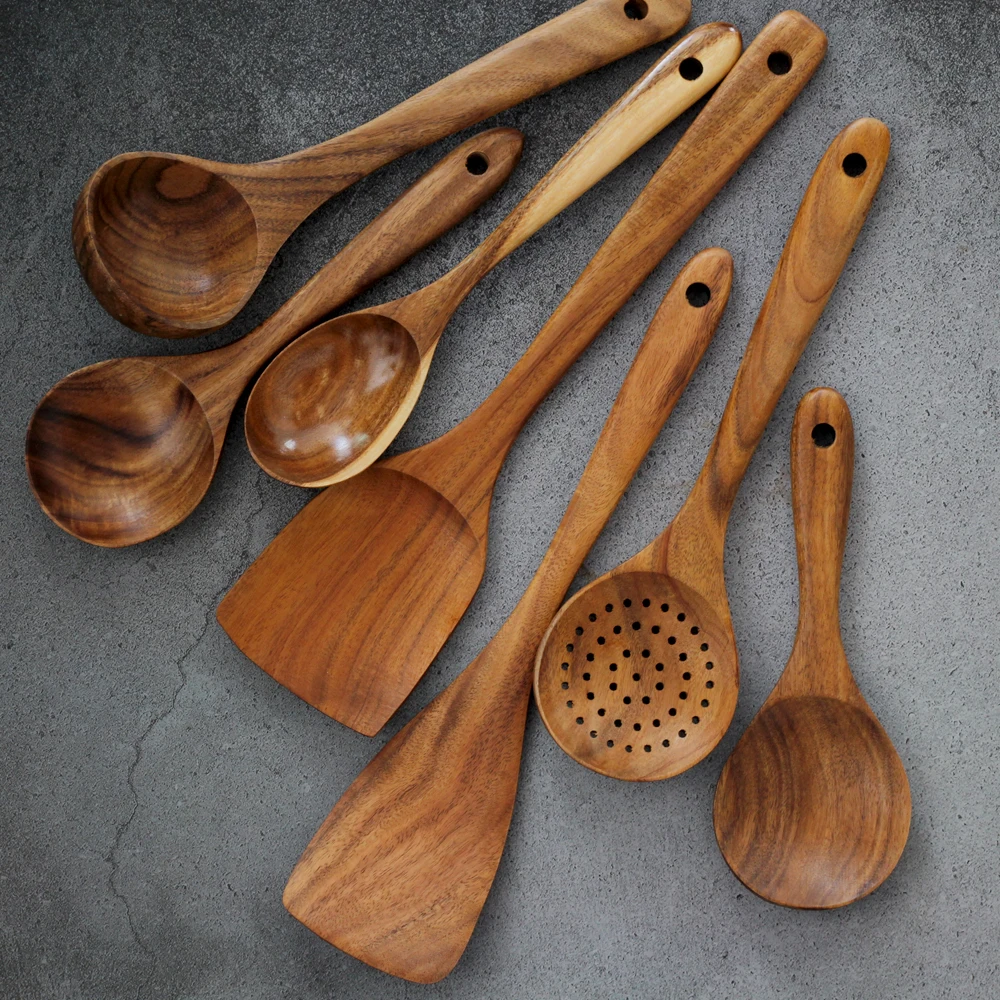Набор кухонных приборов из тикового дерева, 1-7 шт.компл., кухонный инструмент из натурального дерева, ковш, дуршлаг для риса шумовка для супа, ложка, многоразовый