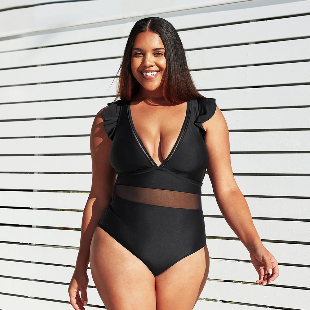Стиль, который вам понравится. Наш сплошной купальник с оборками и V-образным вырезом размера плюс-Милый, но очень сексуальный. Особенности глубокий v-образный вырез спереди и сзади с рюшами на плечах и сетчатыми деталями на талии.
