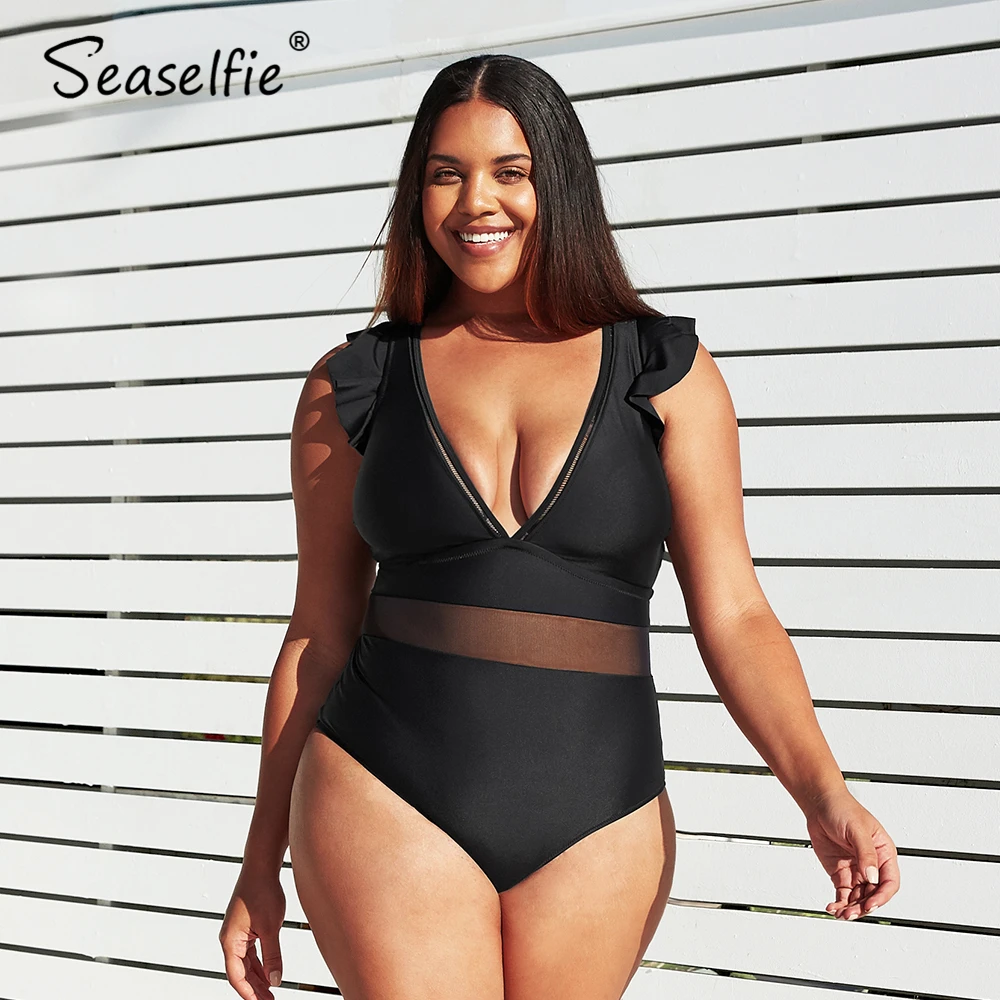 SEASELFIE размера плюс черный сетчатый слитный купальник с V-образным вырезом, женский сексуальный Монокини большого размера, купальный костюм 2022, новый пляжный купальник