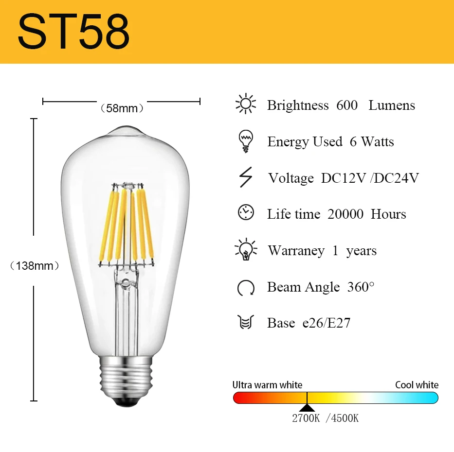 Светодиодная лампа накаливания E27 ST58, 12 В, 24 В, 4500 к, низкое напряжение, 6 Вт, 12 В, светодиодные лампы Эдисона, винтажный теплый белый 2700 к