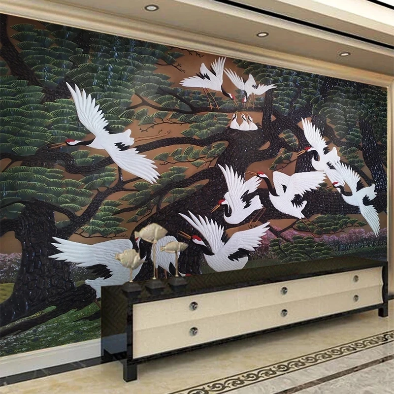 Самоклеящиеся обои в китайском стиле, объемные, объемные, с изображением сосны, животных, журавлей, гостиной, телевизора, дивана, кабинета, домашнего декора