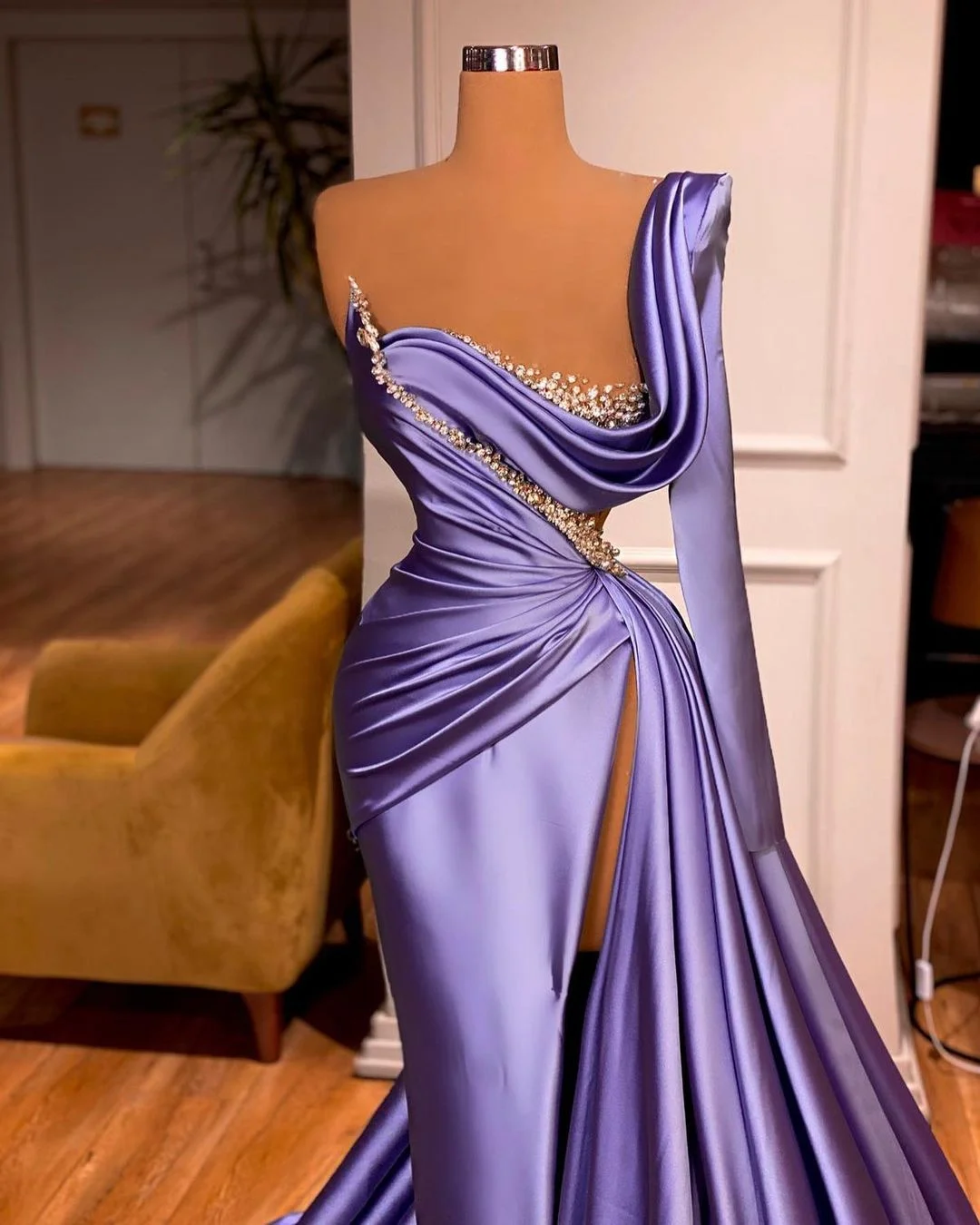 Светильник-фиолетовое вечернее платье с длинным рукавом и шлейфом