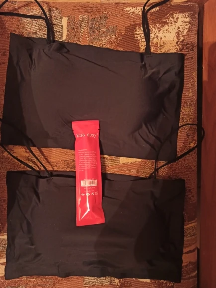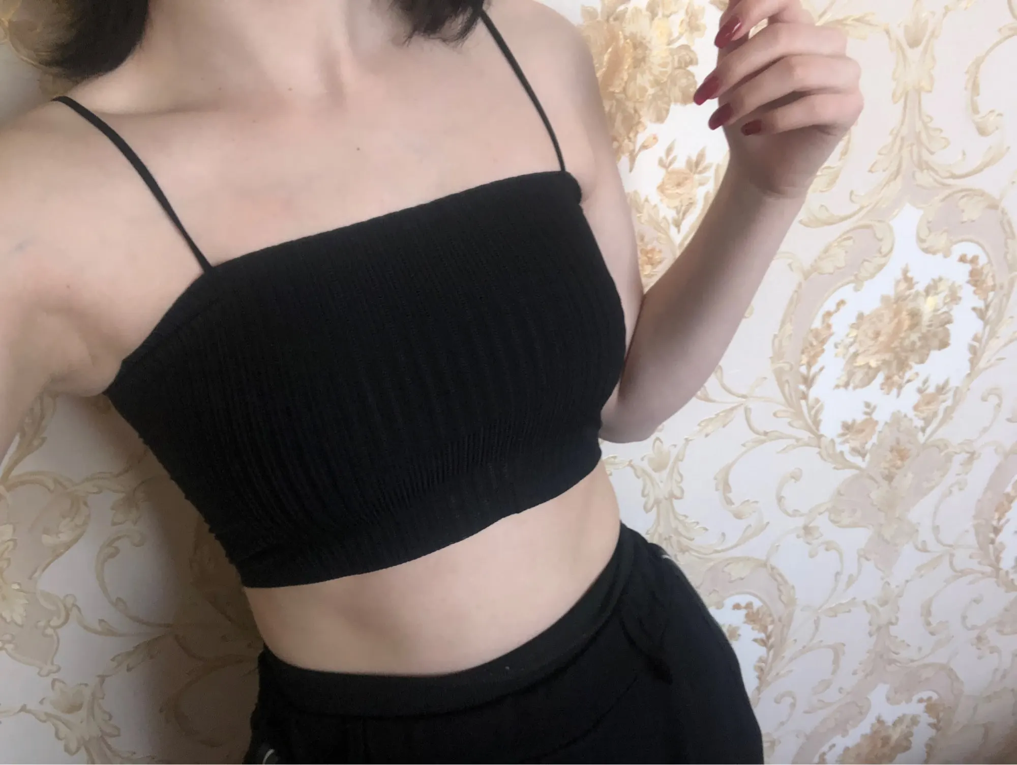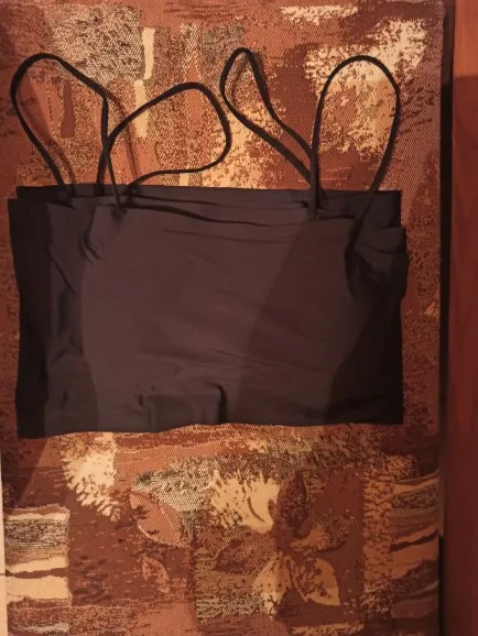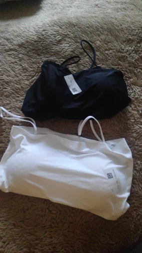 Топы немного длиннее, чем на фото. Качество напоминает материал купальника, внутри поролоновые вкладыши. Черный идеально сидит, а у белого помяты чашки и немного топорщится внизу, не прилегает, как черный. Т.к. я собиралась носить летом как топ, то помятые чашки для меня критично, поэтому звезды снимаю, если расправится я исправлю