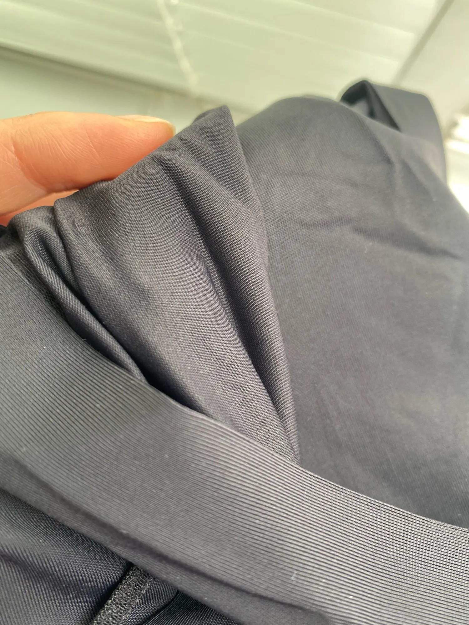 Пришло за 2 месяца. На мой xs сидит хорошо, но снизу спереди свободно( не критично). Ткань как у купальника. Из минусов, то что антипеспирант отпечатывается