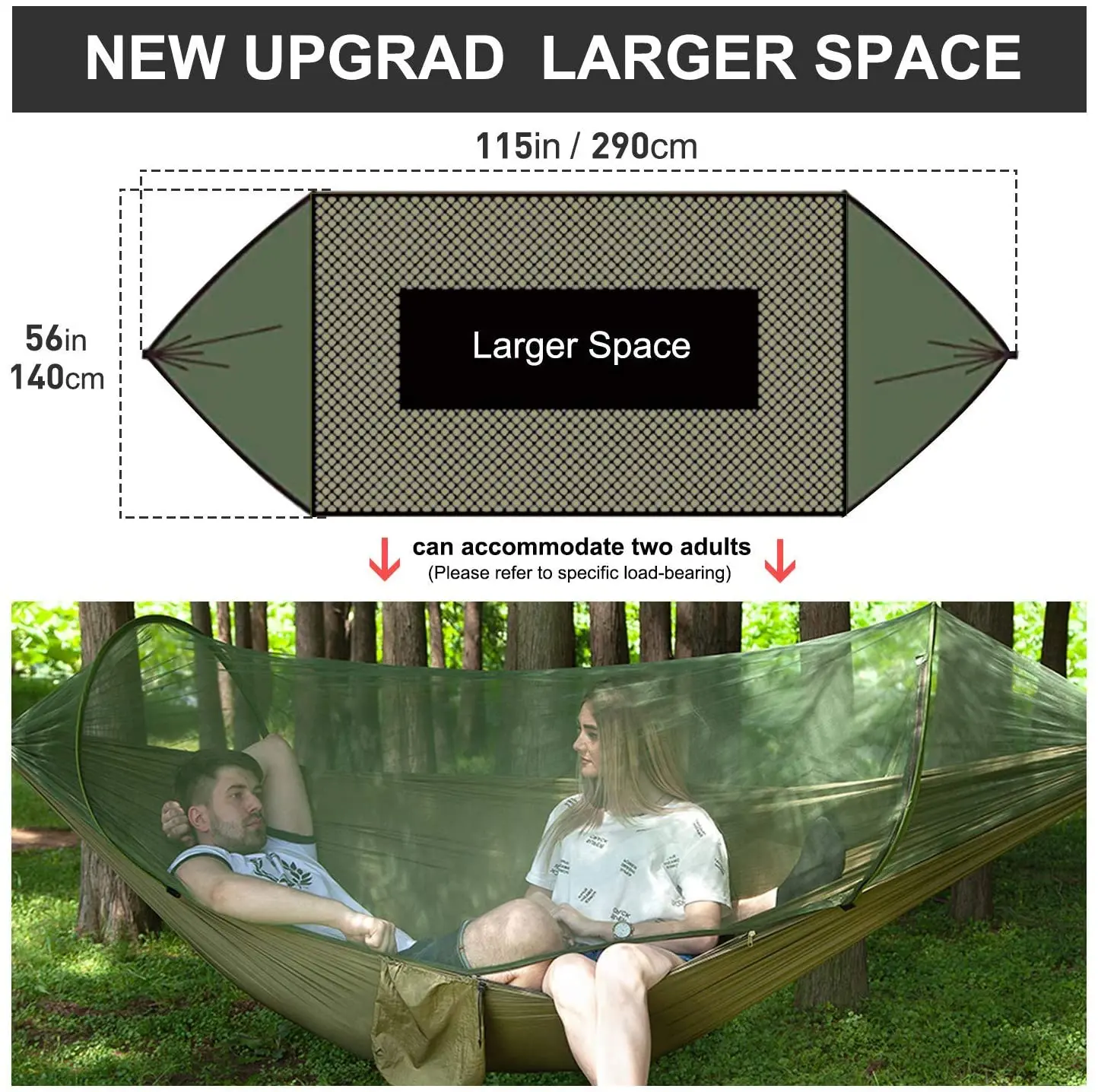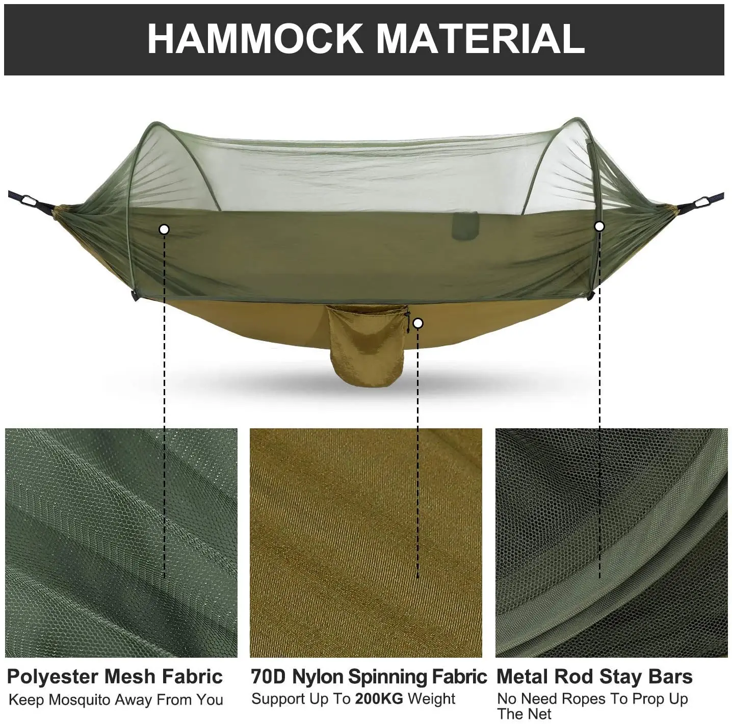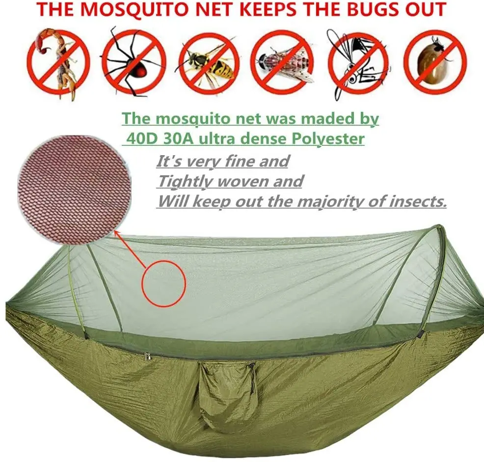 1. 【Автоматическая всплывающая москитная сетка 】:Москитная сетка автоматически всплывет. Это так быстро, чтобы расслабиться всего за одну минуту. Ткань москитной сетки в 2 раза плотнее, чем аналогичные продукты на рынке. С гамаком с москитной сеткой защитит вас от всех этих жутких ползунов, что означает гораздо более безопасное и комфортное путешествие на открытом воздухе.