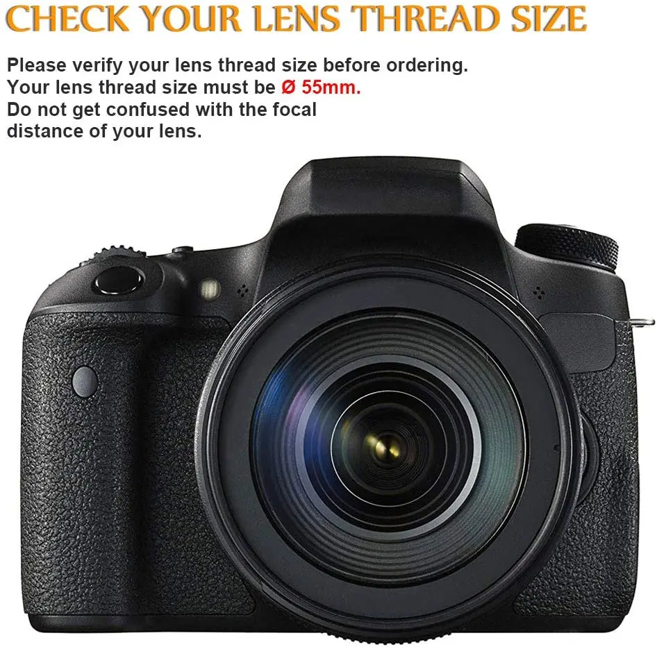 Этот широкоугольный объектив совместим только с линзами 55 мм. Размеры линз различаются независимо от бренда камеры или модели. Размер резьбы объектива вашей камеры будет отмечен где-то на корпусе объектива или напечатан под крышкой объектива. Этому номеру всегда должен быть символ «Ø» (диаметр). Например: Ø55 = 55 мм Размер резьбы объектива.