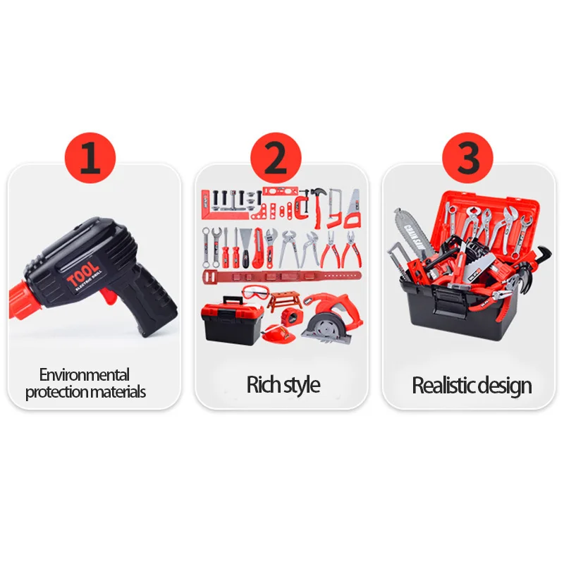 Характеристики: Безопасный инструмент для моделирования: молоток, отвертка, гаечный ключ, шлем и т. Д. Материал игрушки: Изготовлен из экологически чистого материала, не наносит вреда вашим детям. Электрическая дрель: 2 * батарейки типа АА (не входят в комплект) Развитие способностей: обучение хвату и заинтересованности; Практика и мышление, интеллектуальное развитие; Визуальное, сенсорное, слуховое и другое обучение способностям; Координацию рук и глаз, общение родителей и детей, интерактивные игрушки.