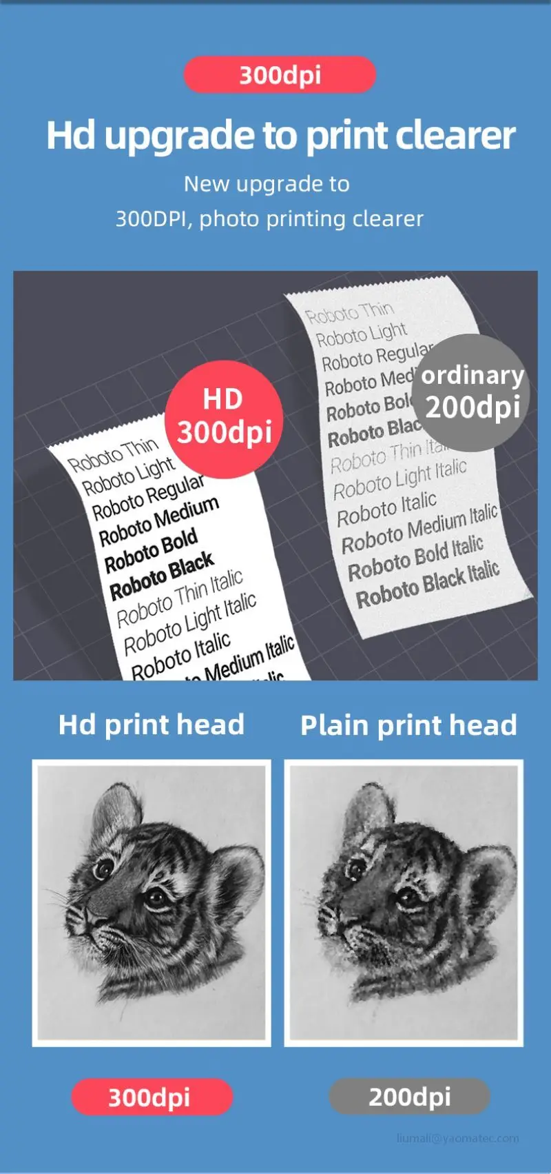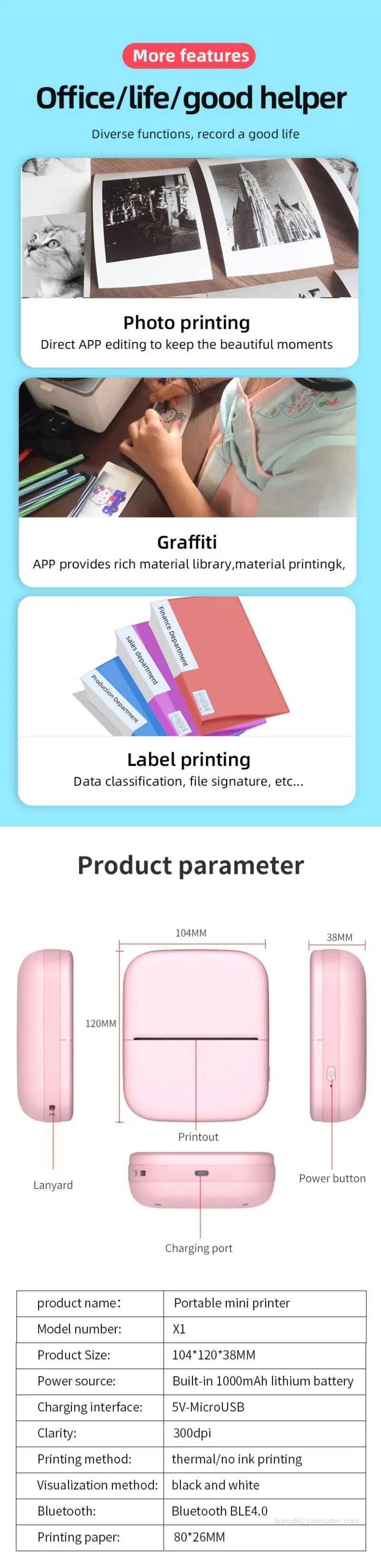 1. Печатающая головка высокого разрешения, четкая печать и стабильная производительность.2. Поддержка нескольких функций, он может печатать фотографии, этикетки, сообщения, списки, записи, qr-код, веб-печать и так далее. Приложение предлагает различные шрифты и темы, чтобы сделать ваши фотографии стильными.3. Встроенный аккумулятор емкостью 1000 мАч, работает при низком уровне шума, термопринтер не нуждается в чернильном картридже при использовании, низкая стоимость эксплуатации.4. Поддержка беспроводного подключения BT со смартфоном и usb-кабелем, подключенным к ПК.5. Записывайте свою жизнь, Печатайте пейзаж, который вы видите, записывайте его или ее сладкие слова, собирайте упражнения, которые вы сделали неправильно, весело и практично.6. Легкий и компактный размер, легко носить с собой.