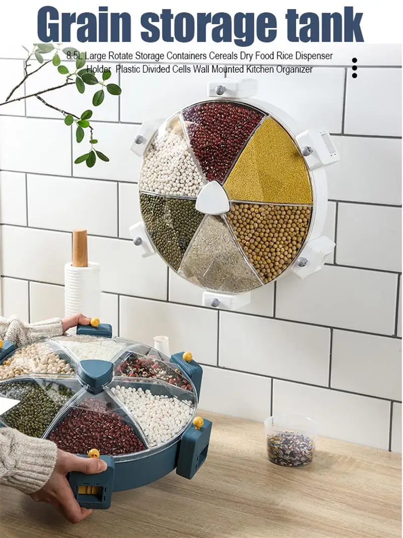 Большие поворотные контейнеры для хранения, 8,5 л, зерновые сухие продукты, держатель для дозатора риса, пластиковые разделенные ячейки, настенный кухонный Органайзер