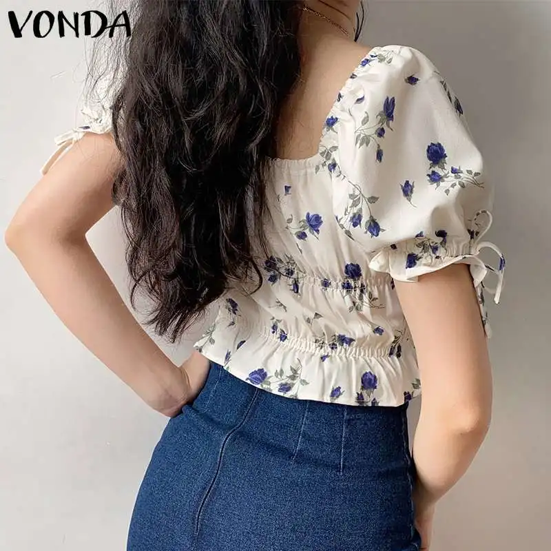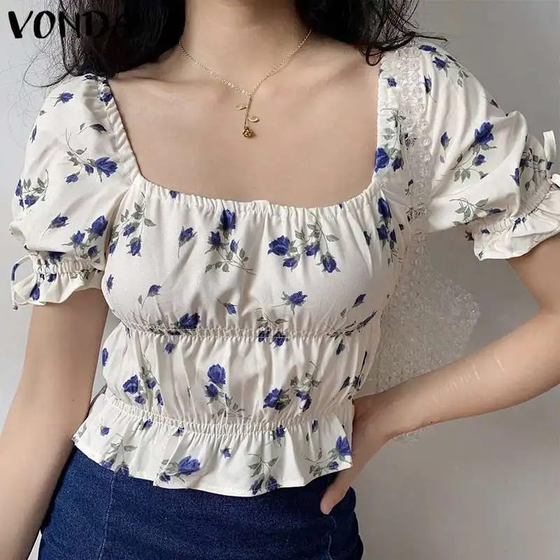 Женские топы, Сексуальная Блузка с пышными короткими рукавами и цветочным принтом, праздничные пуловеры, рубашки, 2021 Вонда, пляжные укороченные топы для отдыха