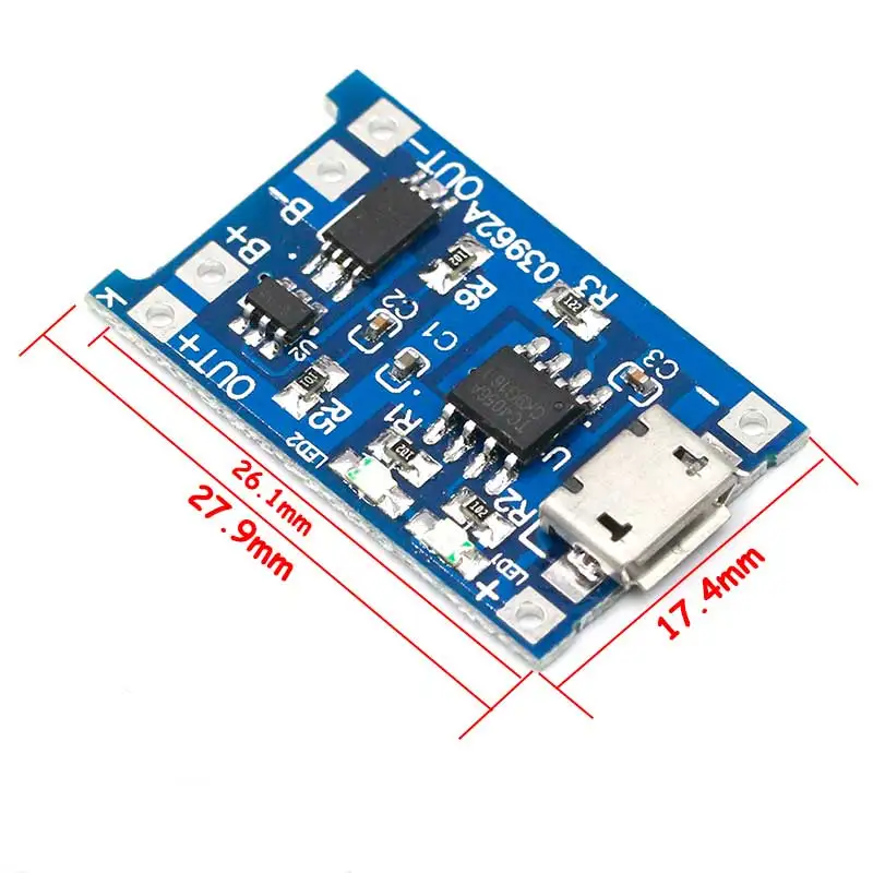 Плата зарядки литиевой батареи 5V 1A Micro USB 18650 Отказ от ответственности: Вход s с гнездом MICRO USB, можно напрямую вводить в зарядку телефона, перезаряжаемую литиевую батарею, И по-прежнему сохраняет входное напряжение проводки колодки, может быть очень удобно DIY Входное напряжение: 5 В Предельное напряжение зарядки: 4,2 ± 1% Максимальный ток заряда: 1000 мА Напряжение защиты от переразряда аккумулятора: 2,5 в Ток защиты от перегрузки аккумулятора: 3 А Размер платы: 2,6*1,7 см