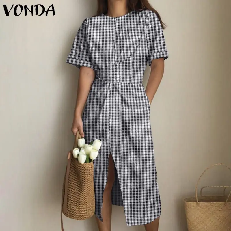 Женское винтажное клетчатое платье VONDA, Повседневный Сарафан в клетку с коротким рукавом, лето 2022