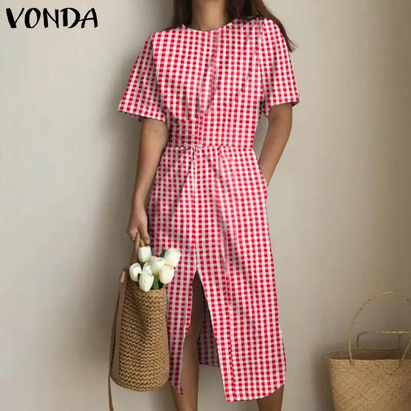 2021 летнее платье VONDA, женские винтажные клетчатые платья с разр...