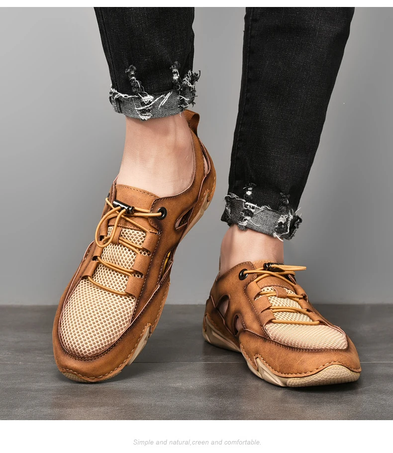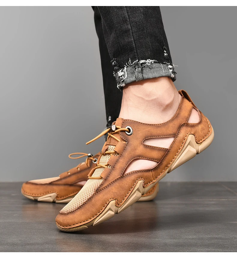 Мужские сандалии из натуральной кожи, коричневые дышащие пляжные са...