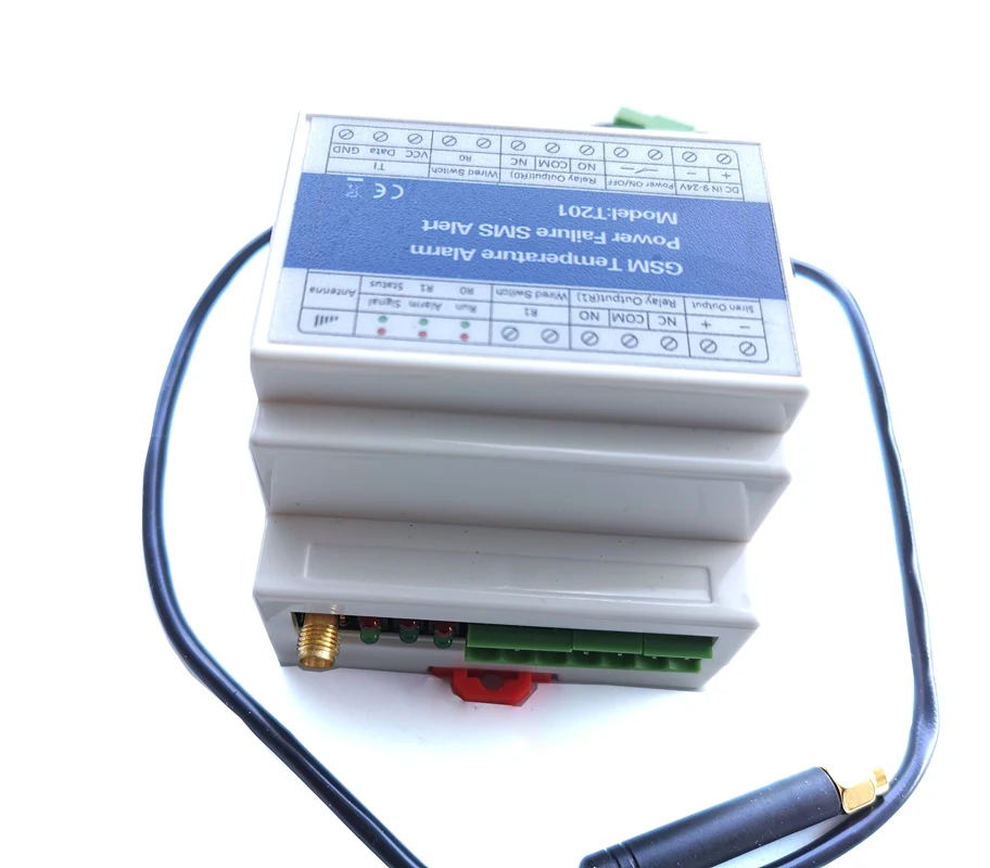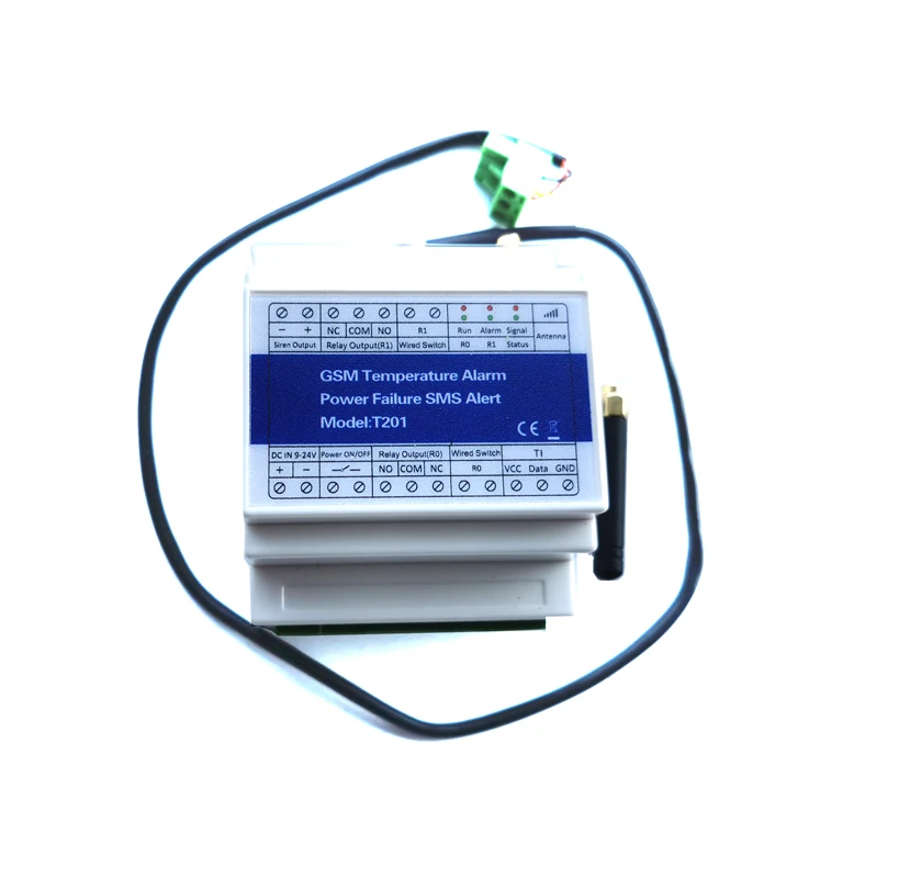 GSM SMS экологическая сигнализация T201 специально для удаленного мониторинга температуры сайта, состояния питания через беспроводную сеть GSM. Когда температура, состояние питания превышает высокий порог или низкий порог, он немедленно отправит SMS-оповещение или позвонит на 6 предустановленных мобильный телефон.