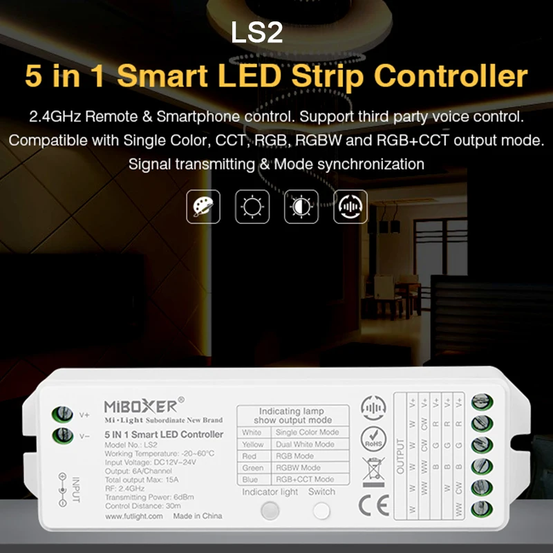 5 в 1 (Одноцветный, CCT, RGB, RGBW, RGB, CCT) умный контроллер-это наш новый высококлассный светодиодный контроллер, управляемый беспроводным пультом дистанционного управления, также с управлением смартфоном и управлением на большие расстояния 4G (требуется Wi-Fi-бокс). Контроллер имеет функцию автоматической передачи и автоматической синхронизации, а также режимы вывода яркости, CCT, RGB и RGBW и RGB + CCT. В этом контроллере используется широко используемая беспроводная технология 2,4 ГГц с низким энергопотреблением, длительной передачей сигнала и сильной защитой от помех и т. д. Один комбинированный пульт дистанционного управления несколькими контроллерами одновременно. Широко используется для управления освещением в гостиницах и домашним освещением.