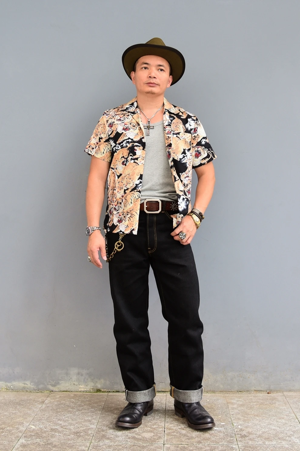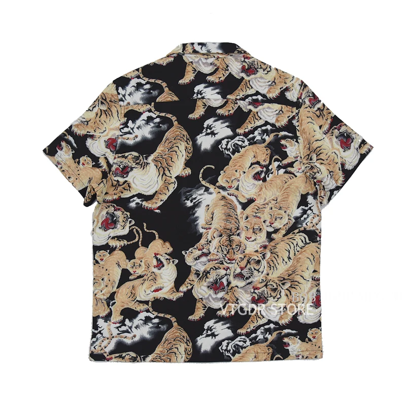 10% вискоза, 15% хлопок, 75% спандекс Самый популярный дизайн в японском стиле Гавайских рубашек, долгожданный перепечатанный «byakko'» (100 тигров) Кокосовые пуговицы Один нагрудный карман Воротник-петля Splay Кромка с квадратным вырезом