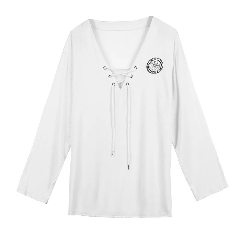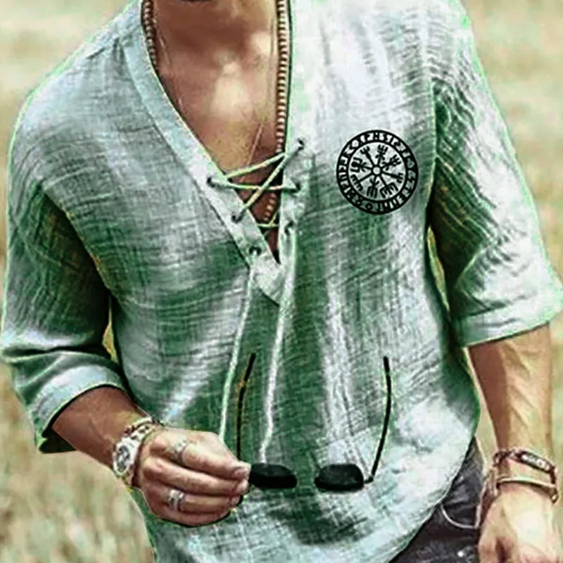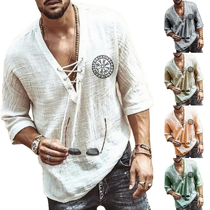 Футболка мужская оверсайз, однотонный пуловер с V-образным вырезом, на шнуровке, Свободный Топ, праздничный пляжный Повседневный льняной топ с рукавом до локтя, на лето