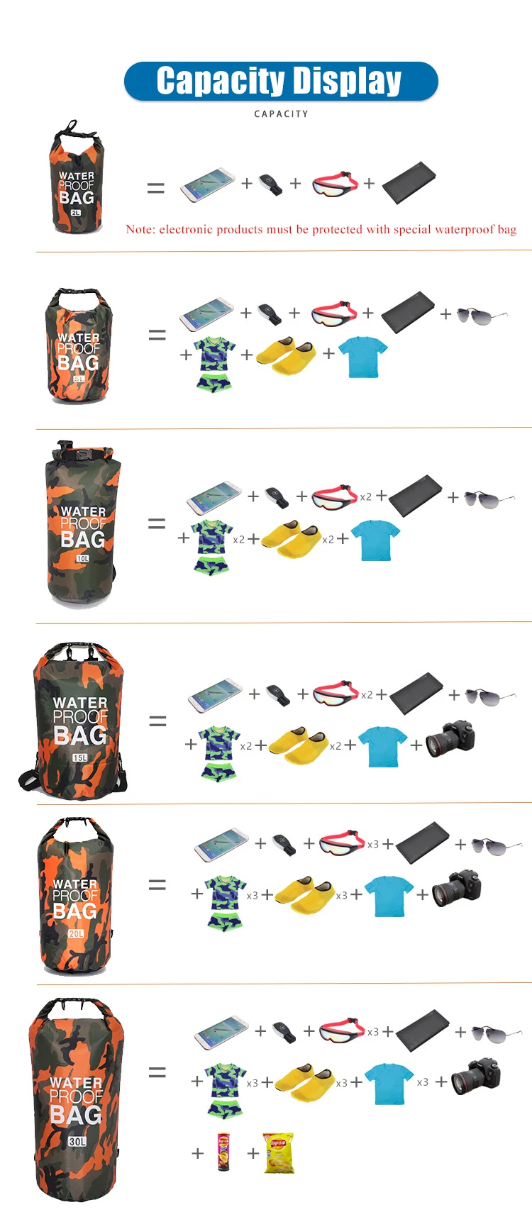 Описание продукта:Водонепроницаемый сухой мешок, должен быть для кемпинга, рыбалки, фестивалей, пляжей, пеших прогулок, каноэ, альпинизма и т. Д. Держите ваши предметы внутри идеально и сухими.Может хранить много вещей и держать их сухими, таких как одежда, карты, книги, камеры, электрооборудование и другие предметы.Защитите ваши вещи от пыли, воды, снега, дождя и всех видов повреждений, просто Наслаждайтесь жизнью на открытом воздухе.Ультра легкий и супер водонепроницаемость. Невероятно Прочный и легкий материал.Легко мыть и долговечно использовать. Пряжка, чтобы вы чувствовали себя в безопасности, и чтобы было удобно открывать или закрывать ее.Спецификация:Материал: ПВХ.Класс водонепроницаемости: IPX6.Размер:2L одного плеча: 11,5*28 см5L одного плеча: 19*40 см10L одного плеча: 19*55 см15L рюкзака: 23*57 см20L рюкзака: 23*63 см30L рюкзака: 24 * 72смПримечание:Из–за разных компьютерных разрешений может быть небольшое цветовое искажение.Возможны отклонения в размере из-за различий в разрешениях компьютера.Пакет включает в себя:1 * портативный плавательный мешок.