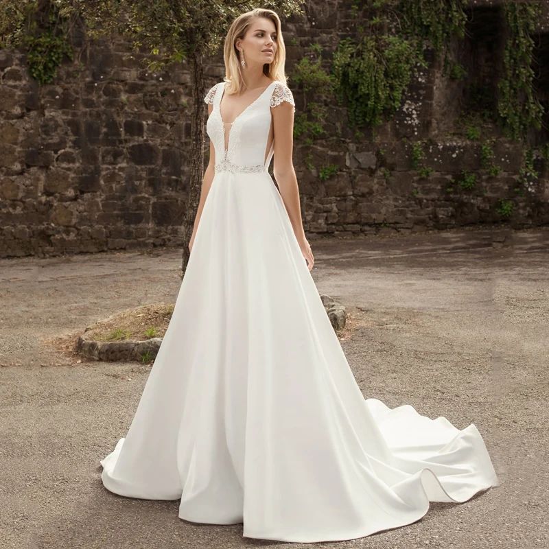 Платье свадебное атласное ТРАПЕЦИЕВИДНОЕ с V-образным вырезом и рукавом-крылышком