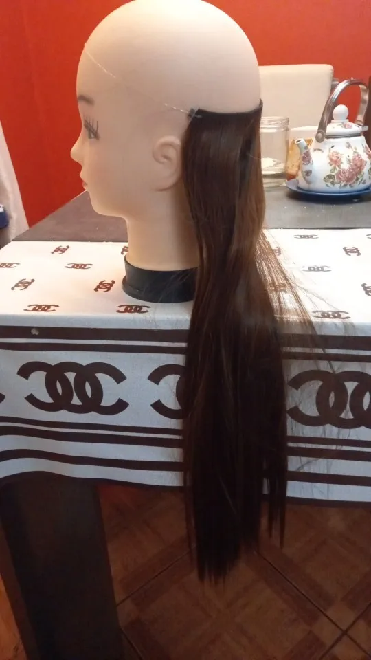 Очень долго шол, волос мягкий но редкий и не покрывает голову весит сзади не туда и не сюда