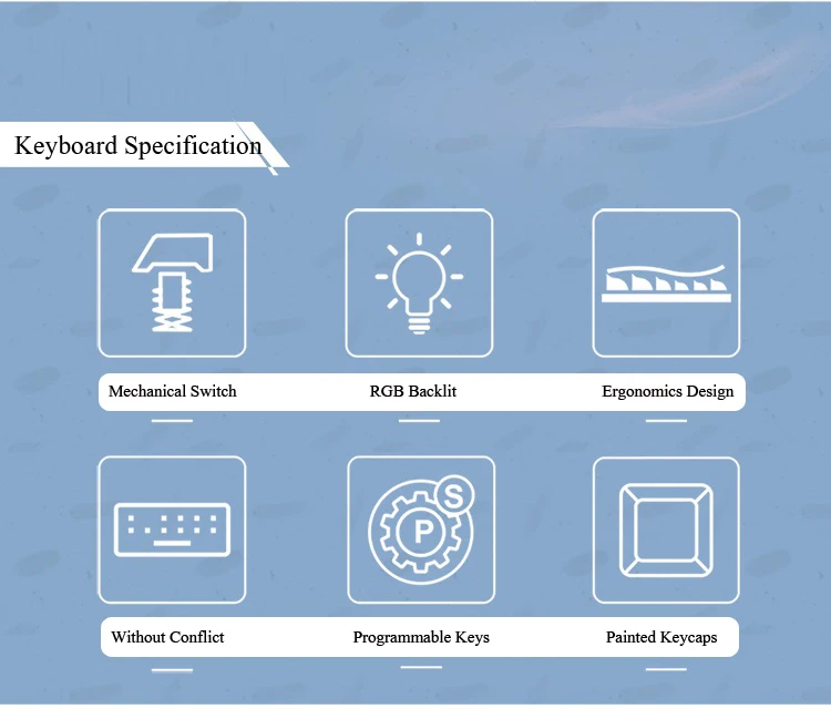 Тип клавиатуры: Механическая клавиатура Бренд клавиатуры: Синий переключатель Интерфейс: проводной Срок службы клавиатуры (раз): 50 миллионов Номер защиты от привидения: 82 Длина кабеля (м): 1,8 Совместимость с: Windows 2000/ 7 / 8/8,1/10 / XP /Vista/ME/MAC OSX