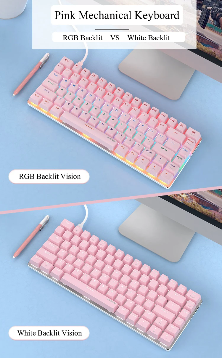 Клавиатура Ajazz AK33, 82 клавиши, Антибликовая, эргономичная, розовая, механическая, прочная, белая подсветка, совместимая с Windows XPVistaMAC