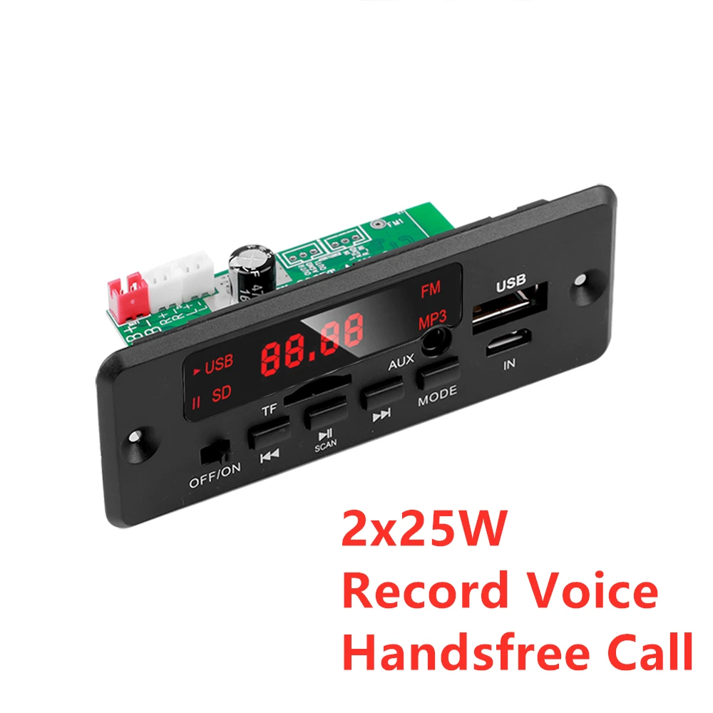 2x25W1. Версия Bluetooth 5,02. Поддержка звонков (нажмите и удерживайте кнопку паузы, чтобы ответить на вызов при входящем звонке).3. Поддержка записи. Запись только поддерживает работу в режиме TF или USB.(Долго нажмите кнопку MODE, чтобы начать запись, долго нажмите кнопку MODE снова, чтобы отменить запись и воспроизвести файл записи; Выход из режима записи и долго нажмите кнопку pause для выхода. При записи необходимо подключить устройство хранения данных, например: u-диск или tf-карта;)4. Поддержка отключения питания памяти6. Напряжение питания поддерживает между DC6v-12v, и ток между 1-3A.7. Может быть напрямую подключен к динамику, с усилителем мощности и функцией декодирования Bluetooth.8. Поддержка формата MP3 / WAV / APE / FLAC9. Основные функции MP3/USB/TF/линейный вход/FM/BLUETOOTH/пульт дистанционного управления/10. Мощность 50 Вт, настоящая стерео 2*25 Вт.11. Поддержка выбора и воспроизведения папок. Когда USB или TF проигрывает, когда в устройстве есть папка и в ней есть песни, нажмите кнопку previous или кнопку next дважды для выбора папки для воспроизведения композиции, и на экране будет отображаться F001-F00N