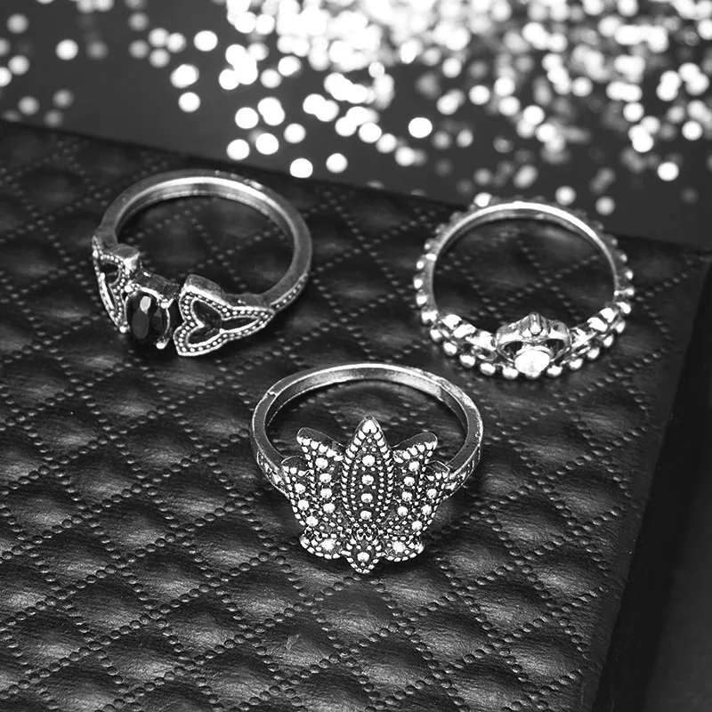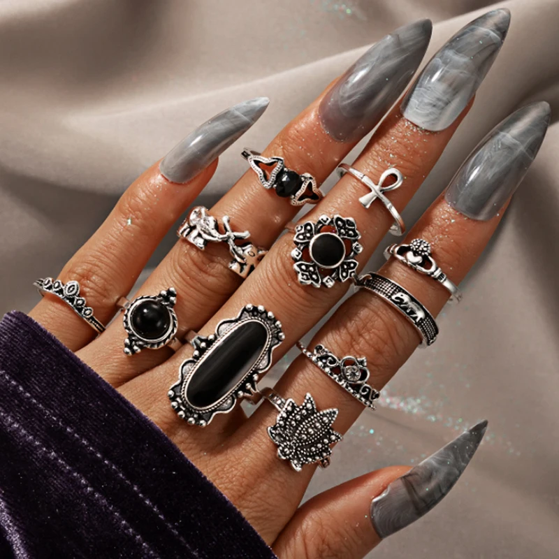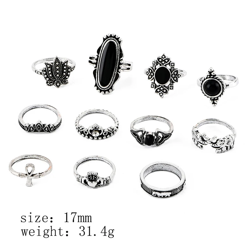 Женские винтажные готические кольца со слонами в виде короны 11 шт., серебристые металлические кольца в стиле панк с черным камнем лотоса, женские вечерние ювелирные изделия