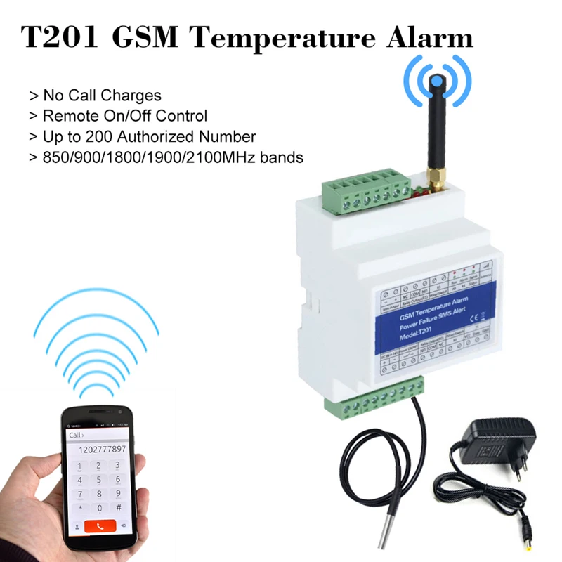 GSM sms-сигнализация T201 специально для удаленного мониторинга температуры на месте, состояния питания через беспроводную GSM сеть. Когда температура, статус мощности превысит высокий порог или низкое пороговое значение, он немедленно отправит SMS оповещения или вызов на 6 предустановленных мобильный телефон.