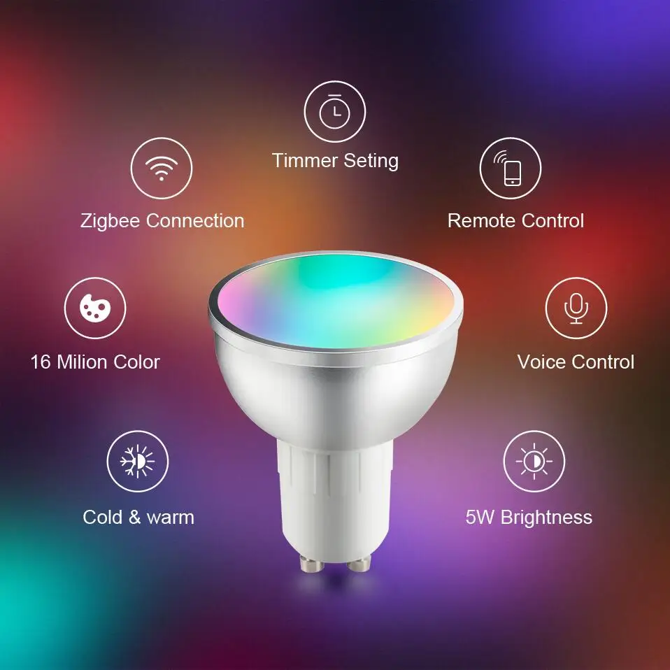 Светильник Интерфейс: GU10 Вход: AC85-265V Приложение: smart life Мощность: 5 Вт Световой поток: 540-600лм Цвет: RGBCW Регулировка яркости: ≥да Цветовая температура: 2700-6500K Сертификация: CE, ROHS, FCC
