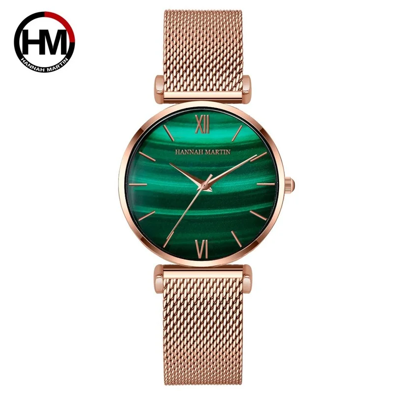 Часы Hannah Martin женские кварцевые, роскошные японские водонепроницаемые с зеленым циферблатом из Малахита, с ремешком из нержавеющей стали, подарок