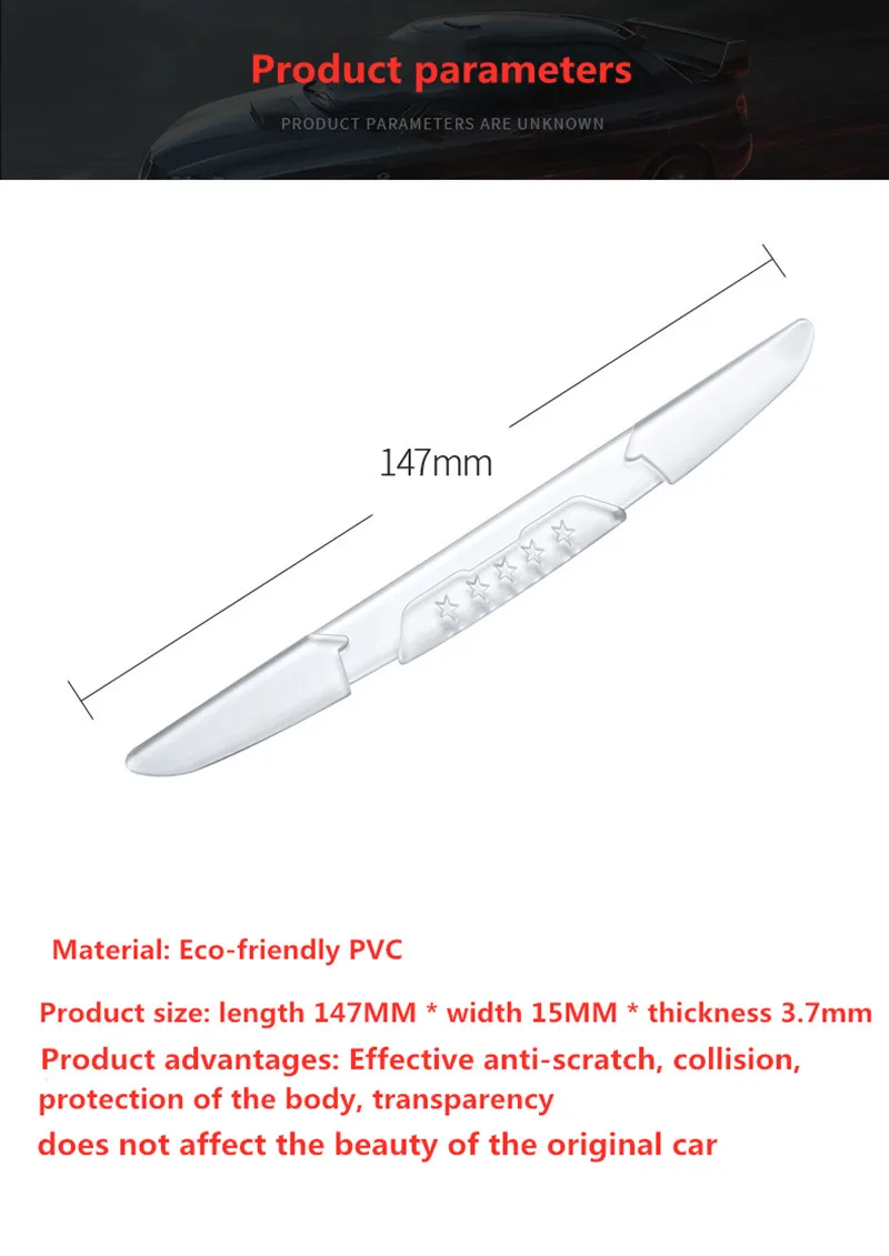 Особенности: 100% абсолютно новый и высококачественный, материал защитные щитки для края автомобильной двери-ПВХ, они чрезвычайно прочные и прочные. ★Пластиковые защитные пленки для автомобильных дверей мягкие и маленькие (Размер: long147mm xwidth 15mm xthick 3,7mm) ★Защищает края двери автомобиля от царапин и истирания ★Поставляется с клеем на задней панели. Простая установка, избегайте воды и удаляйте в течение 24 часов, чехол с автомобильным угловым бампером легко отпадает ★Элегантный и динамичный дизайн, хорошо сочетается со всеми видами автомобилей. Этот товар может быть установлен в передней и задней части автомобильной двери. Он обрабатывает специальное покрытие, защита углов бампера, избегайте царапин автомобиля
