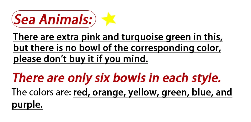 ★Морские животные: в этом есть дополнительные розовые и бирюзовые зеленые, но нет чаши соответствующего цвета, пожалуйста, не покупайте, если вы возражаете.★В каждом стиле есть только шесть чаш, цвета: красный, оранжевый, желтый, зеленый, синий и фиолетовый.