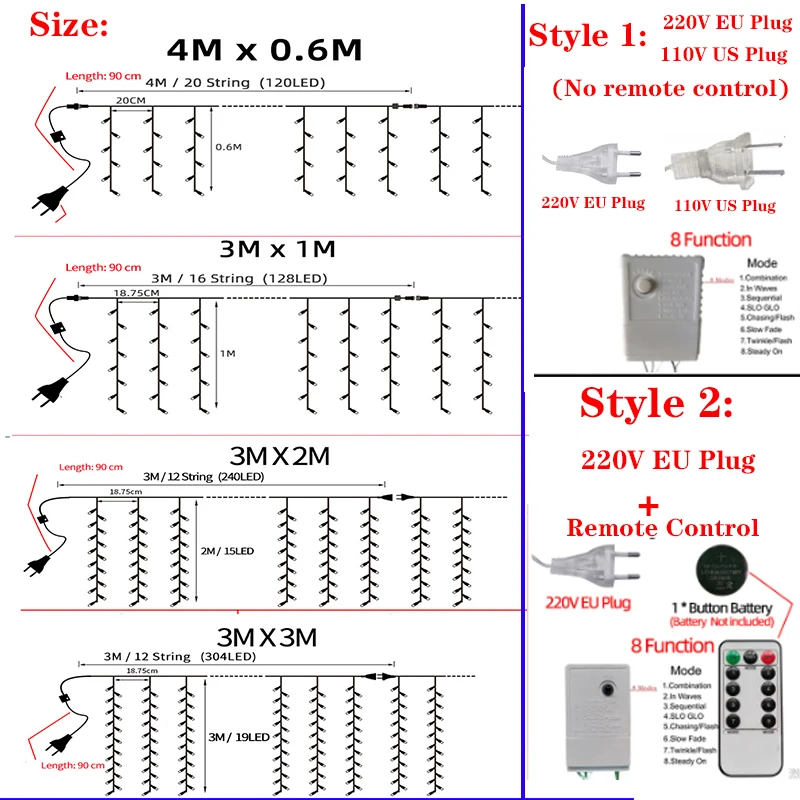 8 функциональный контроллер:1. Комбинация; 2.In волны; 3. Последовательный; 4. Медленное свечение; 5. Чеканка/вспышка; 6. Медленное выцветание; 7. Мерцание/вспышка; 8. Устойчивый. Вы можете настроить светильник в соответствии с атмосферой активности. Стиль 2:220V ЕС вилка + пульт дистанционного управления УправлениеБатарея дистанционного управления:1 * CR2025Кнопочный аккумулятор(Батарея в комплект не входит)