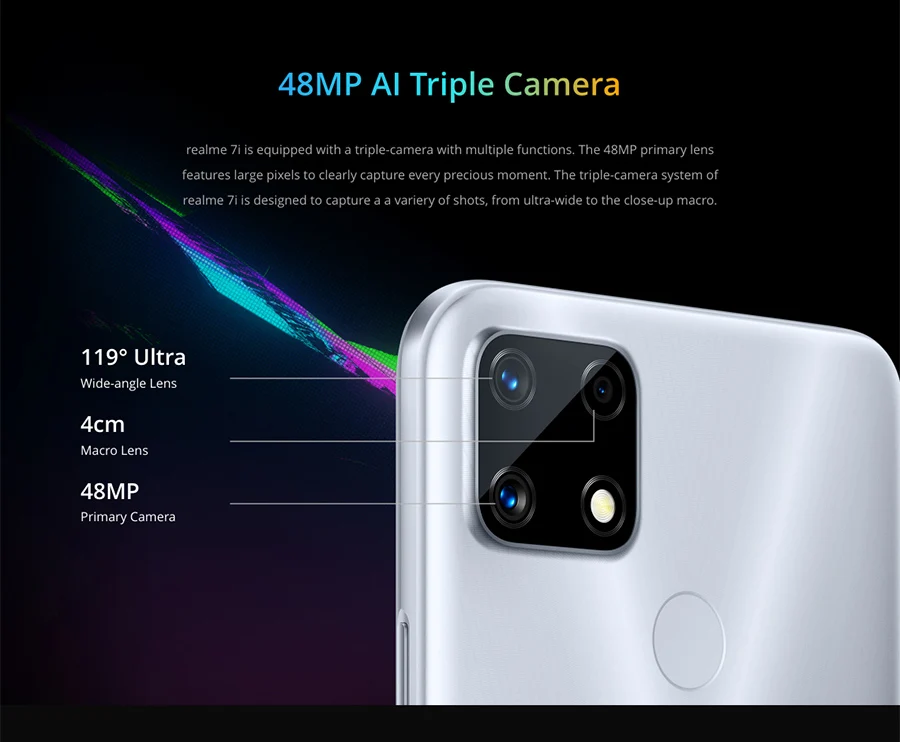 Тройная камера 48 МП AlRealme 7i оснащен тройной камерой с несколькими функциями.